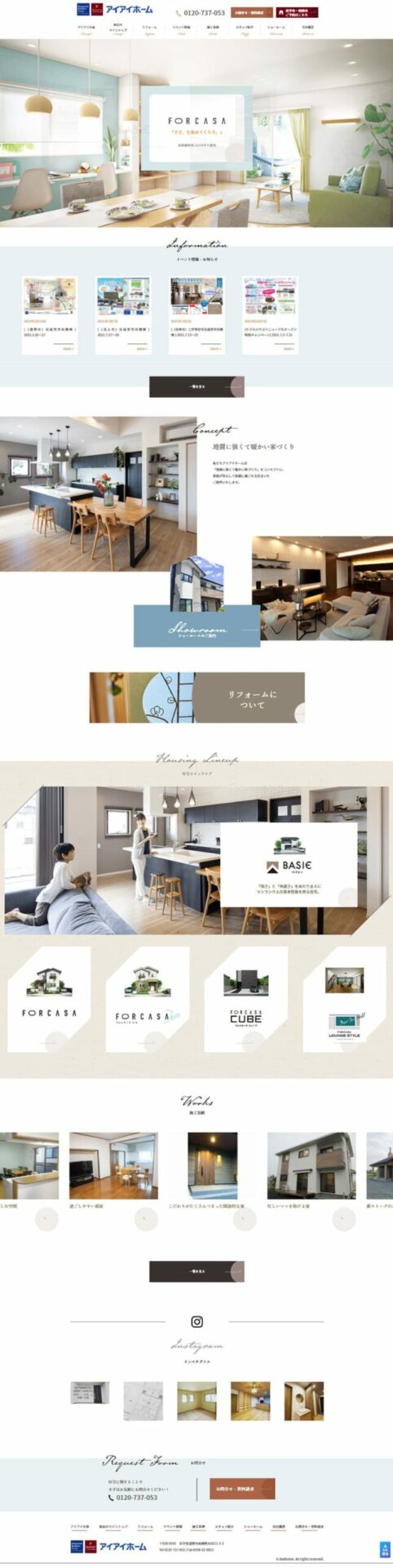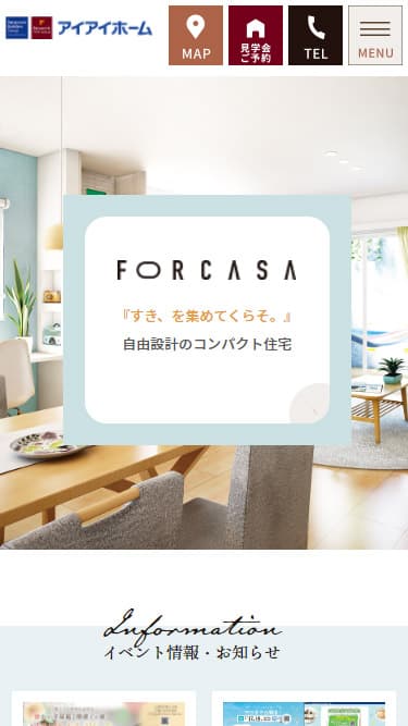 コンテンツ部分には、イベント情報のほか、「コンセプト」や「住宅ラインナップ」を掲載し、取扱商品がひと目でわかる構成となっています。