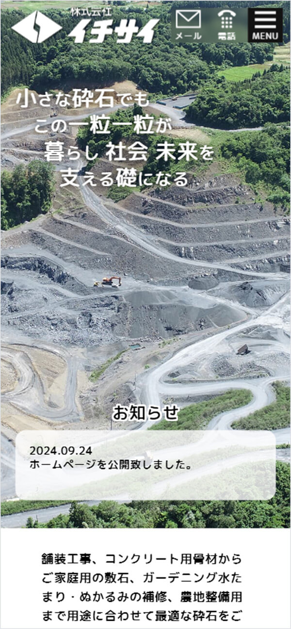 株式会社イチサイ 様 「砕石」という一般の方には馴染みの薄い商品について、わかりやすく感じてもらえるよう、砕石の工事現場写真を配置 硬いイメージにならないよう要所要所で曲線や角丸を使用したデザインにしています。 URLhttps://ichisai.jp/ 地域・業界・業種 一関市 / 砕石 デバイス・仕様PC、スマートフォン、WordPress 担当業務等Webサイト設計/情報設計/デザイン/CMS構築/更新操作指導