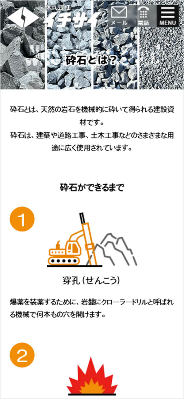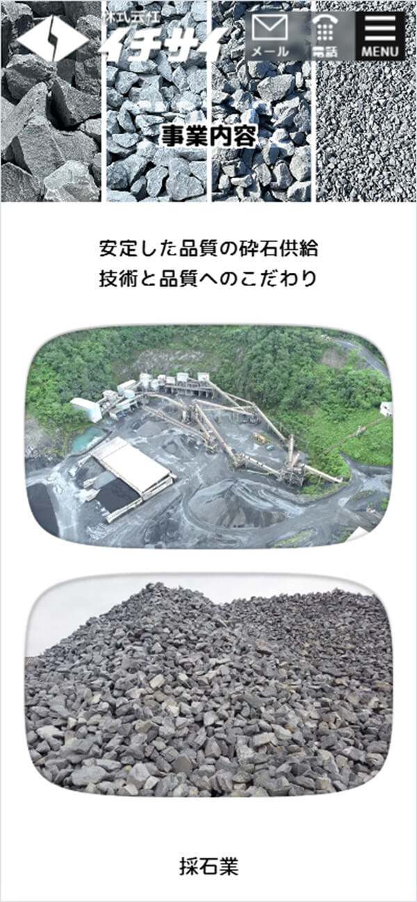 「砕石」という一般の方には馴染みの薄い商品について、わかりやすく感じてもらえるよう、砕石の工事現場写真を配置