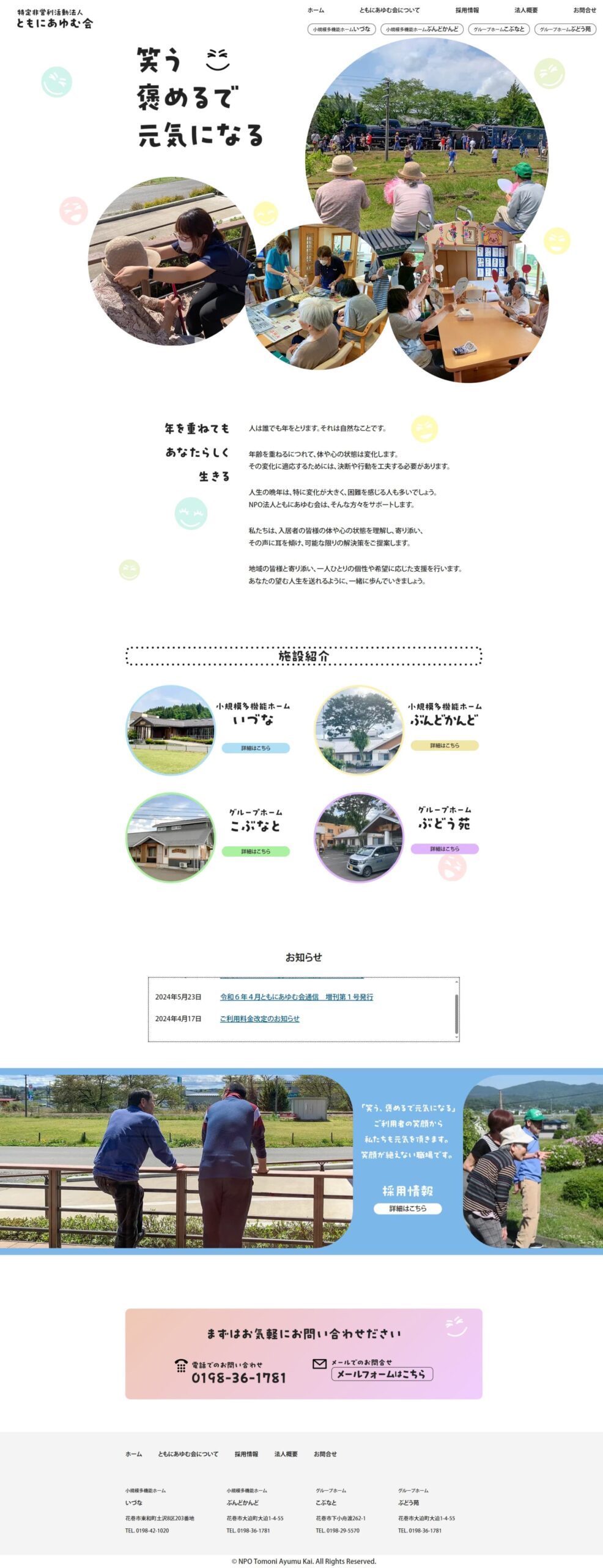 特定非営利活動法人ともにあゆむ会 様 円形にくり抜いた写真と、笑顔をモチーフにした丸いイラストを使用し、柔らかい雰囲気と、笑顔が集まる楽しく明るい場所を表現。 親しみやすさや、温かさを感じてもらえるよう、見出しやキャッチコピーには、太めで手描き文字のような素朴な雰囲気の書体を使用。 文章や、セクション間の余白を十分に確保し、読みやすく、すっきりとした印象のレイアウトにしました。 URLhttps://tomoniayumukai.com/ 地域・業界・業種 花巻市 / 介護 デバイス・仕様PC、WordPress、レスポンシブ 担当業務等Webサイト設計/情報設計/デザイン/CMS構築/更新操作指導