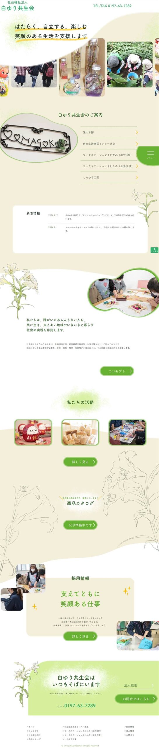 社会福祉法人白ゆり共生会 様 温かみを感じられるデザイン案ゆっくりと穏やかな構成になるよう全体的に丸みを帯びた構成に。 可愛くなりすぎないよう、リアル寄りな白百合のイラストをポイントに配置し、綺麗めな雰囲気も加えた。 また余白を多めに取ることで、すっきりとした印象に。 URLhttps://shirayuri-k.com/ 地域・業界・業種 北上市 / 社会福祉 デバイス・仕様PC、スマートフォン、WordPress 担当業務等Webサイト設計/情報設計/デザイン/CMS構築/更新操作指導
