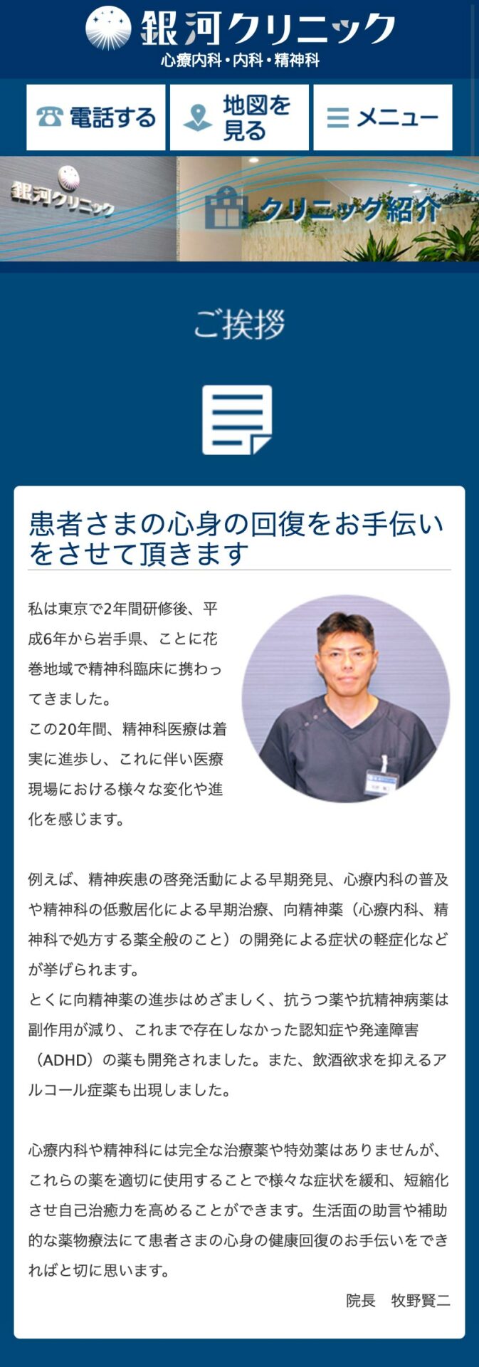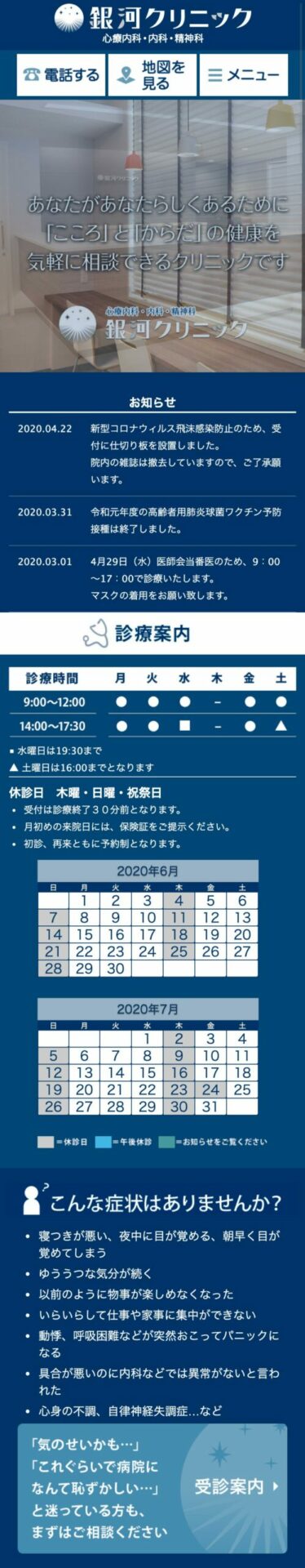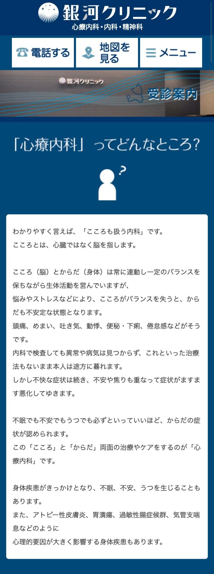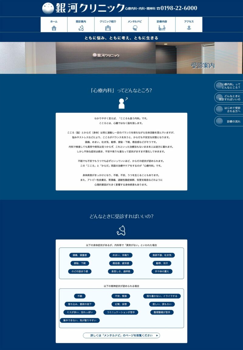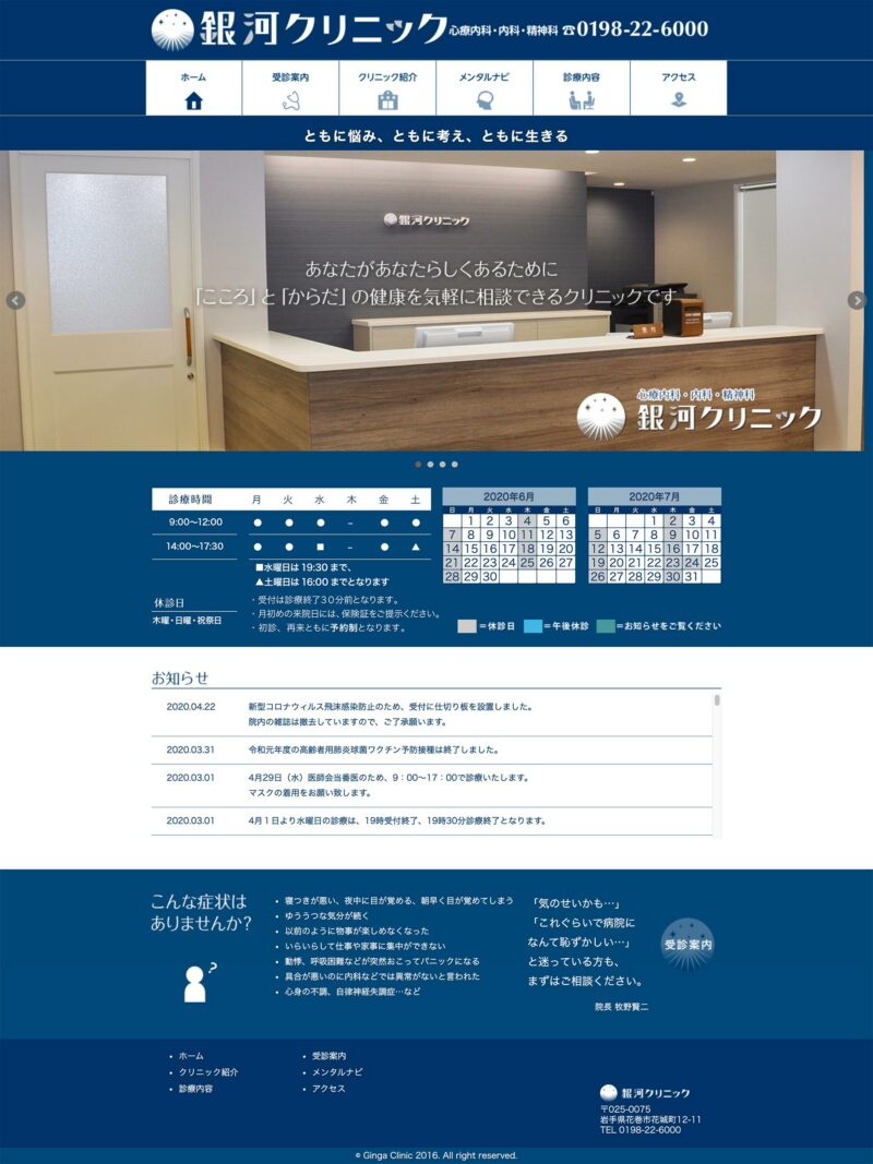 銀河クリニック 様 URLhttp://www.ginga-clinic.com/ 地域・業界・業種 花巻市 / 心療内科 デバイス・仕様PC、スマートフォン、NucleusCMS 担当業務等Webサイト設計/情報設計/デザイン/CMS構築/更新操作指導