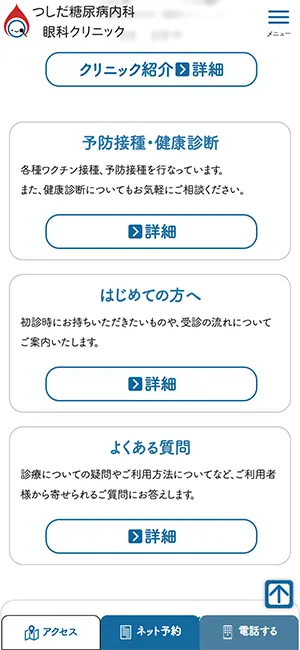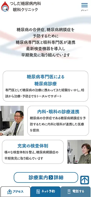 つしだ糖尿病内科・眼科クリニック 様 トップページではクリニック内の写真を掲載し、はじめて利用する方がクリニックの雰囲気を感じ取り、不安を軽減する効果が期待できます。 また、明るい色使いと余白を十分に確保したレイアウトで、見る人の緊張を緩和し、清潔感を感じさせる構成にしました。 URLhttps://tsd-cl.com 地域・業界・業種 盛岡市 / 糖尿病内科・眼科 デバイス・仕様PC、スマートフォン、Wordpress 担当業務等Webサイト設計/情報設計/デザイン/CMS構築/更新操作指導