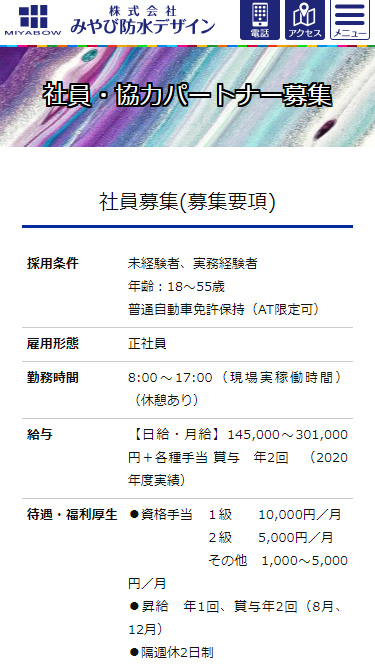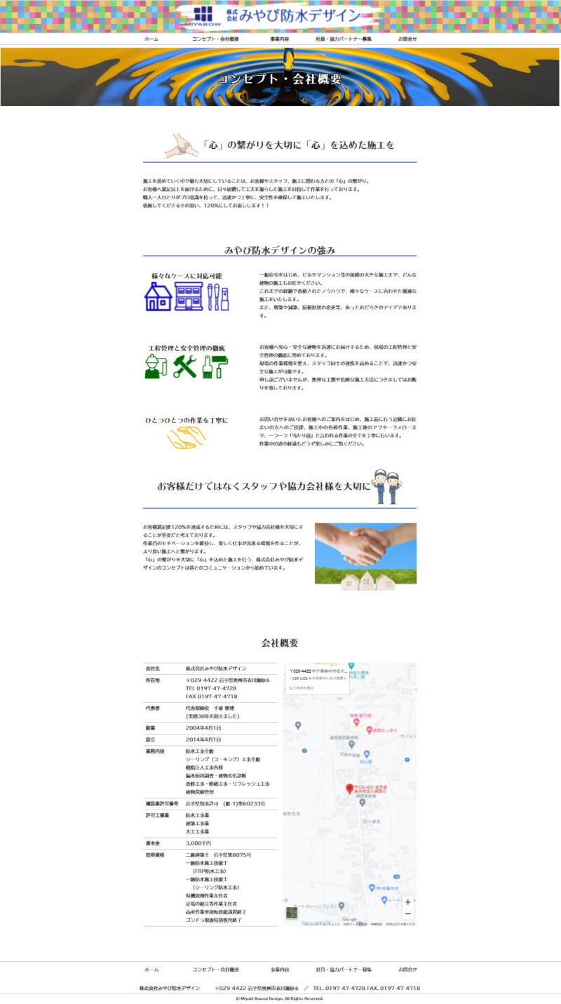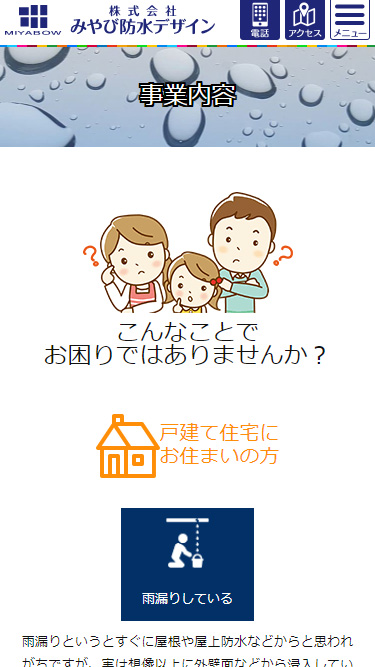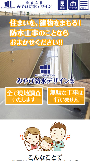 みやび防水デザイン 様 URLhttps://miyabow.co.jp/ 地域・業界・業種 奥州市 / 防水工事 デバイス・仕様PC、スマートフォン、WordPress 担当業務等Webサイト設計/情報設計/デザイン/CMS構築/更新操作指導