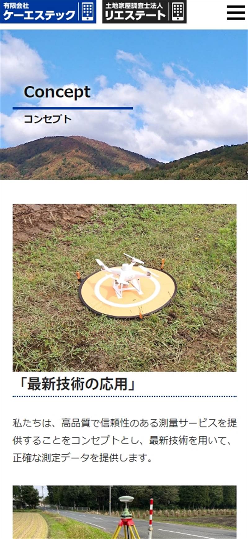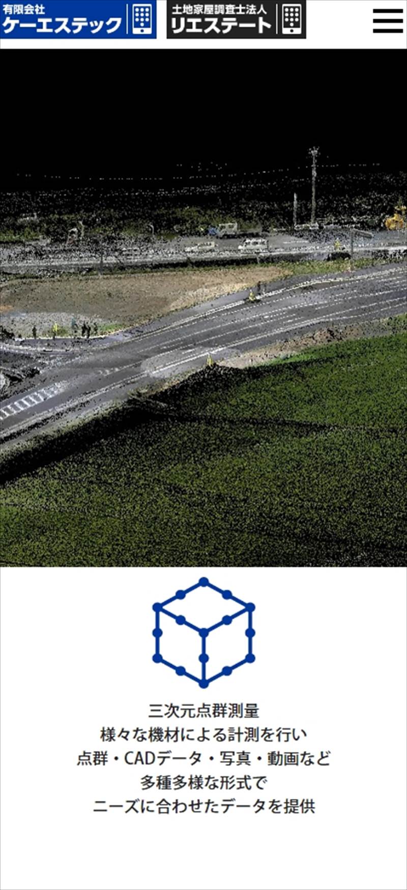 有限会社ケーエステック 様 ファーストビューでは、「3 次元点群測量」「測量」「土地家屋調査士」3つの業務について、それぞれの業務の概要文とイメージ画像をスライド形式で掲載。 全体的には白背景に紺色をキーカラーとした配色で、誠実さ、実直さを表現。 また、所々に、測量に使用するレベルロッドをモチーフにした模様や、それぞれの業務をイメージしたアイコンを配置。幾何学的な形状や図形で、正確さをイメージさせます。 URLhttps://www.kstec-2008.com/ 地域・業界・業種 奥州市 / 測量 デバイス・仕様PC、スマートフォン、WordPress 担当業務等Webサイト設計/情報設計/デザイン/CMS構築/更新操作指導