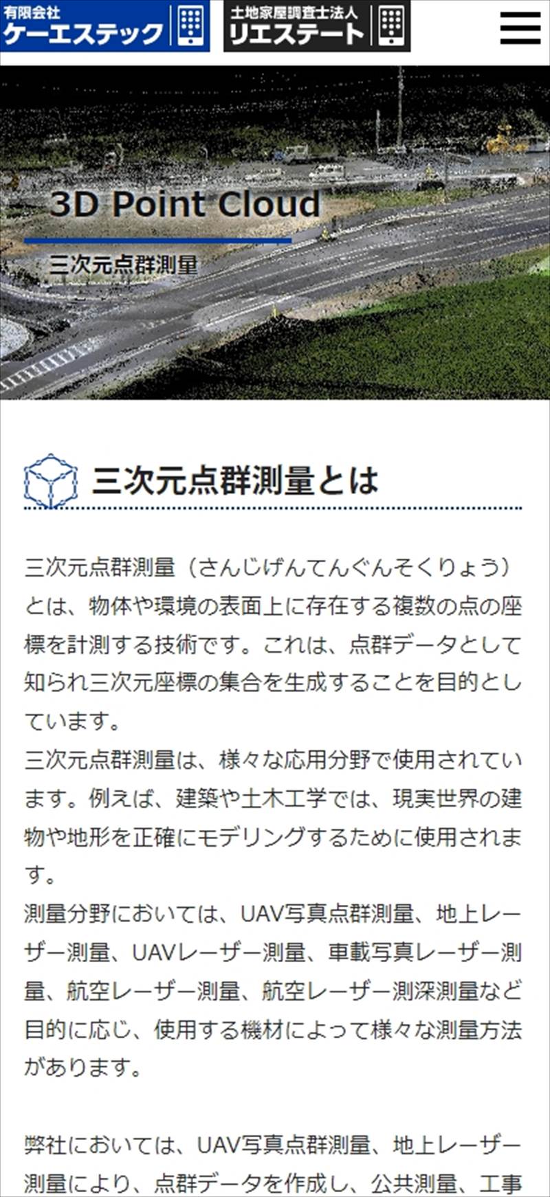 ファーストビューでは、「3 次元点群測量」「測量」「土地家屋調査士」3つの業務について、それぞれの業務の概要文とイメージ画像をスライド形式で掲載。