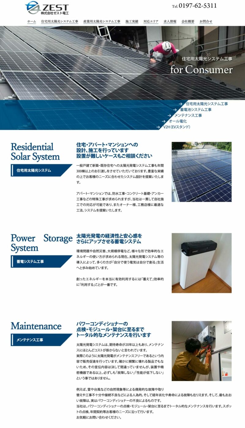 ゼスト電工 様 太陽光発電設備の工事を専門とする、電気工事会社のWebサイト。 太陽光発電システムを中核に、様々なサービスを提供する同社の特徴を、作業現場や施工後の施設写真を配置して表現しました。 白に、企業カラーのブルーを使用したシンプルな構成ながら、斜めのラインを取り入れたデザインで画面に変化を与えています。 URLhttp://www.zest-denko.com/ 地域・業界・業種 北上市 / 太陽光発電システム デバイス・仕様PC、WordPress 担当業務等Webサイト設計/情報設計/デザイン/CMS構築/更新操作指導