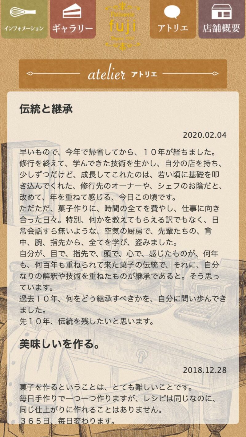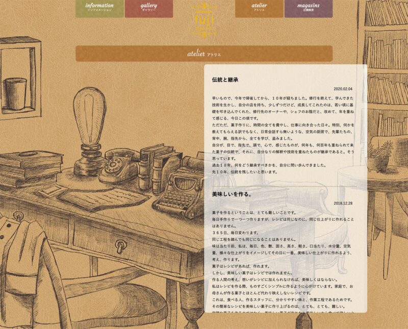 パティスリーフジ 様 店舗イメージの再PR、再周知のためのホームページを作成。 店舗の雰囲気や1950年創業ということを踏まえ、シックで落ち着つきのある厳かな雰囲気を表現。 下層ページの表示展開にはただのページ移動ではなく動きを取り入れ、伝統の中にも遊び心が感じられるデザイン設計になっています。 URLhttp://www.patisserie-fuji1950.com/ 地域・業界・業種 一関市 / ケーキ販売 デバイス・仕様PC、スマートフォン、NucleusCMS 担当業務等Webサイト設計/情報設計/デザイン/CMS構築/更新操作指導