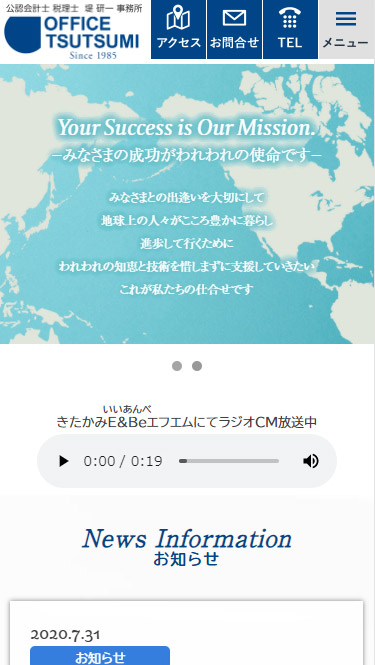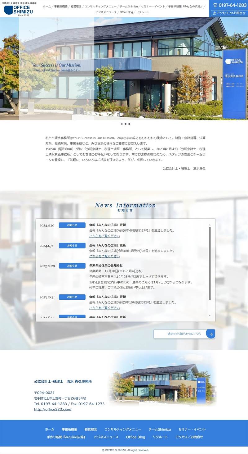 公認会計士 税理士 清水真弘事務所 様 地域に根ざし、様々な経営者をサポートする公認会計士 税理士 堤 研一 事務所様のホームページ。 見た人に信頼性や安心感を与えるため、所内やスタッフの写真を多数使用しました。 会計・税務のみにかかわらず、様々な側面から経営をサポートする姿勢を、業務紹介だけではなく、理念や信念も掲載し根本の考え方を知っていただくことで、さらなる信頼性や安心感に繋がるよう考慮しました。 URLhttp://www.office223.com/ 地域・業界・業種 北上市 / 会計事務所 デバイス・仕様PC、スマートフォン、WordPress 担当業務等Webサイト設計/情報設計/デザイン/CMS構築/更新操作指導