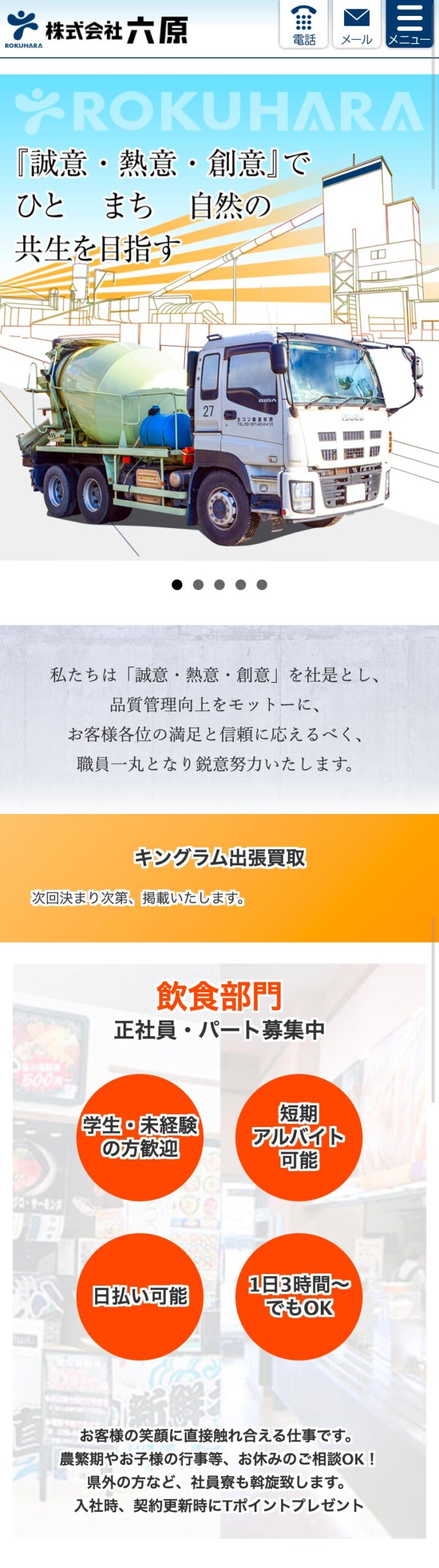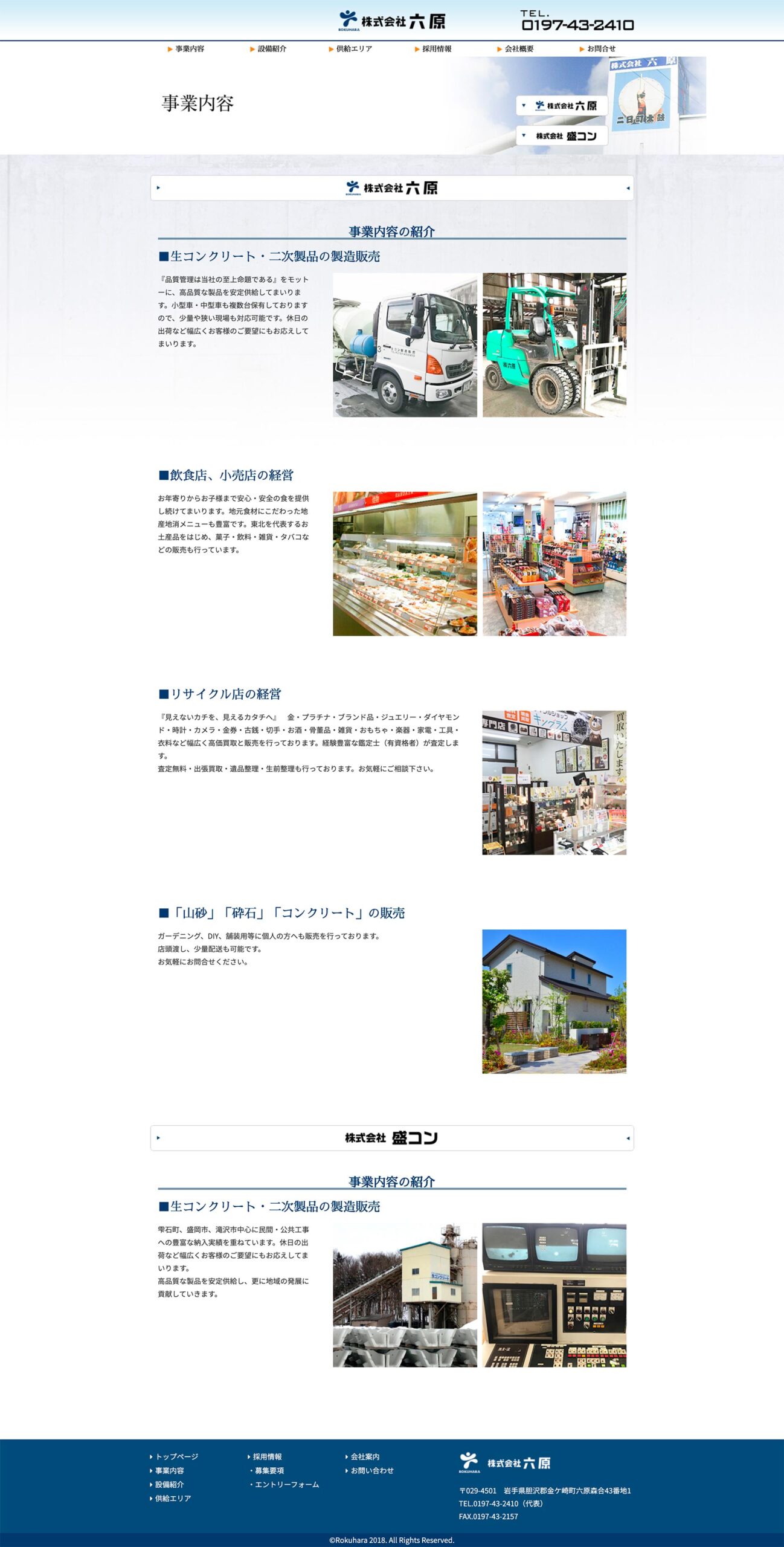 六原 様 コンクリートや、その二次製品の製造をメインとしながら、飲食店、リサイクルショップの経営と、多角的に事業を行っている会社のWebサイト。 業務内容を象徴するミキサー車の写真と、工場設備のイラストの組み合わせに、暖色系を加えた色合いで明るいイメージを加え、様々な設備として社会基盤に欠かせない同業務をより身近に感じてもらえるよう表現しました。重い雰囲気になりがちな設備を線画のイラストにすることで、爽やかで清潔な雰囲気を感じさせます。 事業案内や採用情報部分で設備やスタッフの写真を掲載し、業者様向けにも、求職者向けにも、業務内容や職場の雰囲気が伝わりやすくなるよう考慮しました。 URLhttp://www.rokuhara.co.jp/ 地域・業界・業種 金ケ崎町 / 生コンクリート製造 デバイス・仕様PC、スマートフォン、NucleusCMS 担当業務等Webサイト設計/情報設計/デザイン/CMS構築/更新操作指導