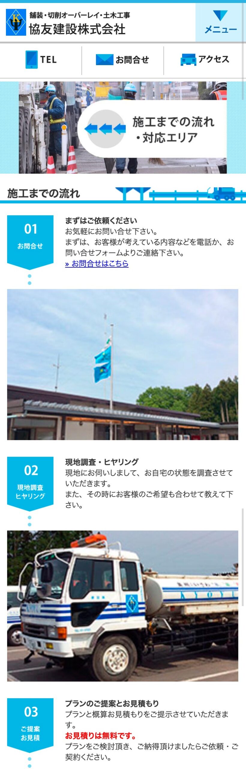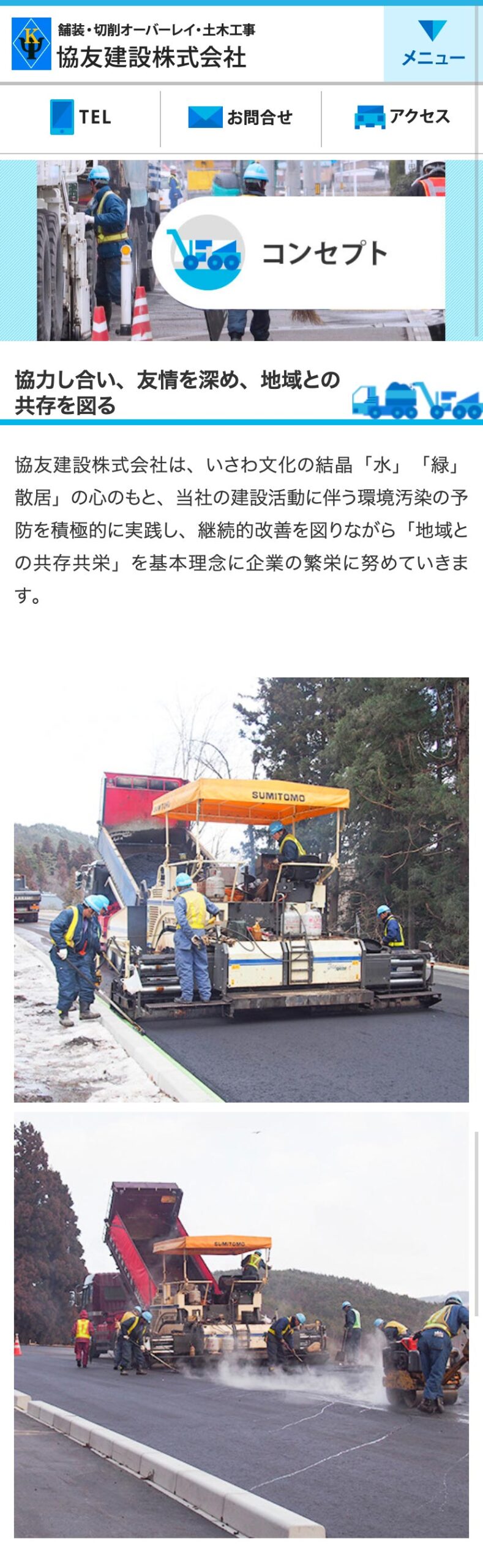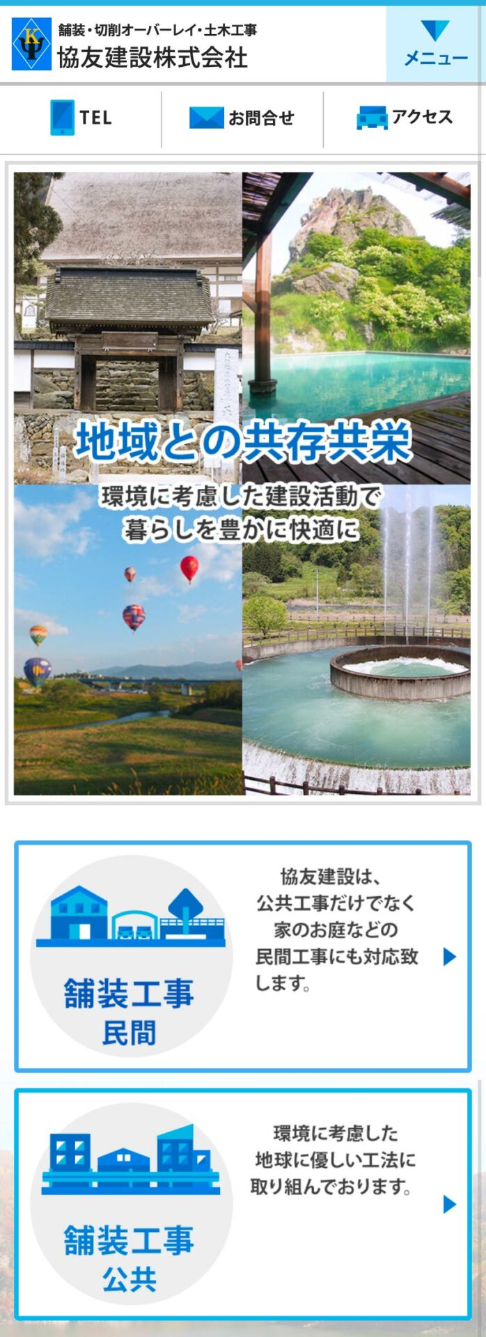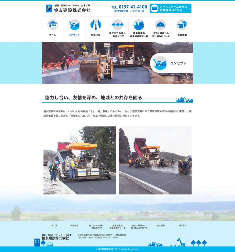 協友建設 様 会社のPR、再周知としてホームページを作成。 各メニューをアイコンでビジュアル化し、イメージが伝わりやすいデザインになっています。 アイコンやイラスト、背景色などはブルーを基調に誠実さを表現。 地元の風景写真を掲載し、舗装工事を介して地域との繋がりをPR。 URLhttp://www.kyoyu-k.co.jp/ 地域・業界・業種 奥州市 / 舗装工事 デバイス・仕様PC、スマートフォン、NucleusCMS 担当業務等Webサイト設計/情報設計/デザイン/CMS構築/更新操作指導
