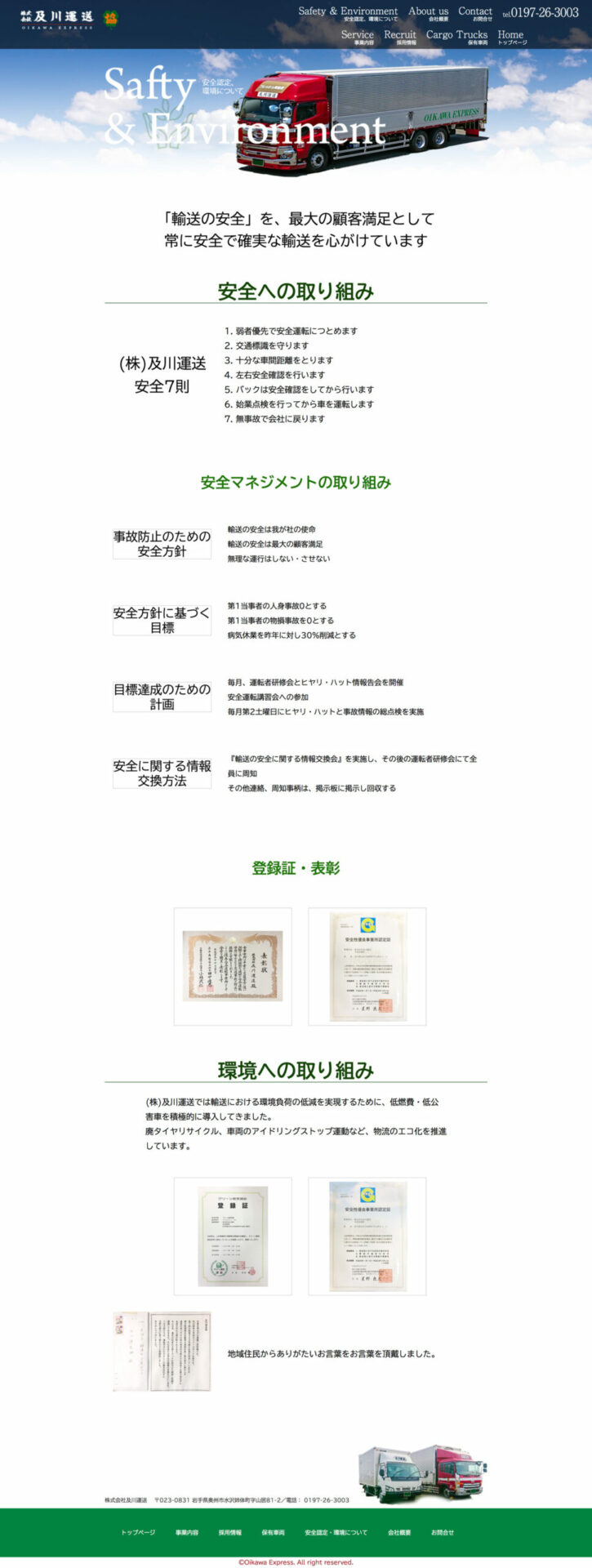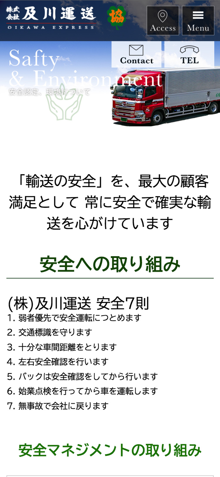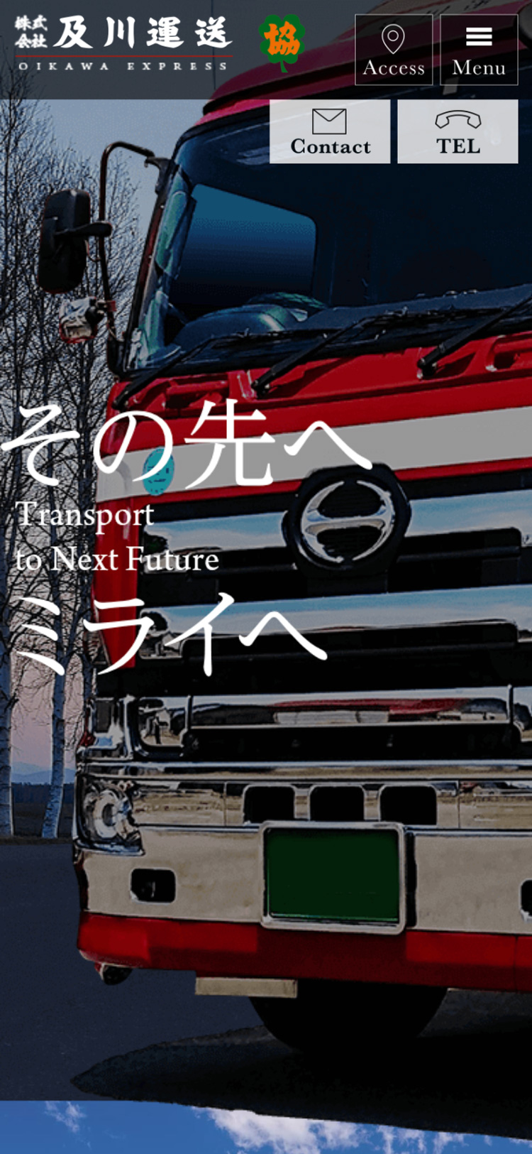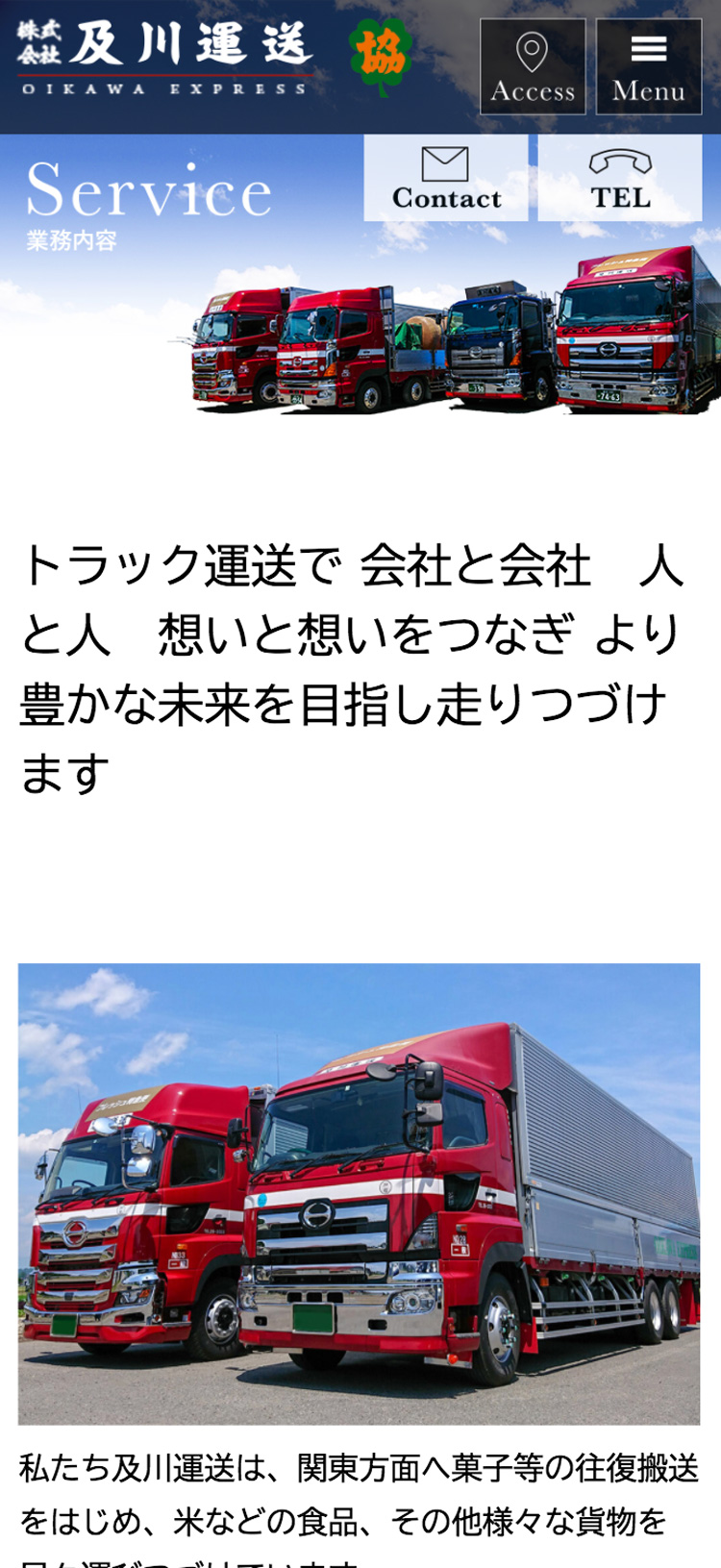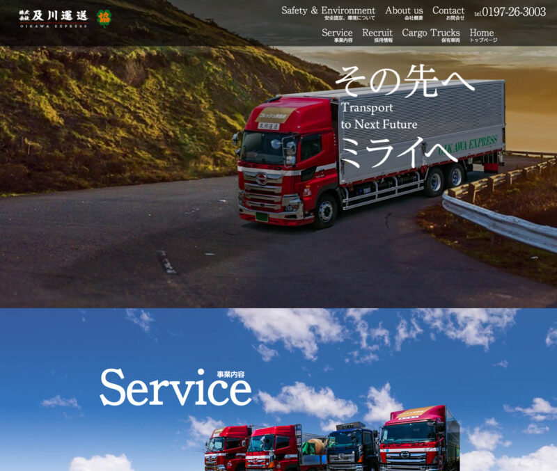 及川運送 様 トラックの赤を引き立てるよう、彩度を抑えた写真を背景にし、トラックを配置。 トラックを画面からはみ出すほどの大きさで配置することで、シンプルながらインパクトのある、印象に残るようなレイアウトとしました。 ナビゲーションも、半透明の黒に白文字のシンプルなカラーリングで、見やすさを保ちながら、写真を引き立てるよう考慮しました。 メインイメージは、背景部分が自動で順次切り替わり、さまざまな場所をトラックが走り抜けるイメージを表現しました。 スクロールした先には、業務内容ページなどへのリンクを配置。 最初の画面とは印象を変え、余白を大きくとり、すっきりとしたレイアウトにしました。 見出しやアイコンなども黒で統一することで、トラックの赤色を引き立て、印象付けます。 URLhttp://oikawa-express.com/ 地域・業界・業種 奥州市 / 運送 デバイス・仕様PC、スマートフォン、WordPress 担当業務等Webサイト設計/情報設計/デザイン/CMS構築/更新操作指導
