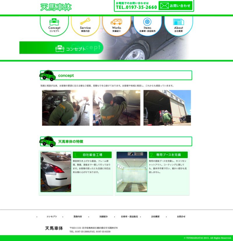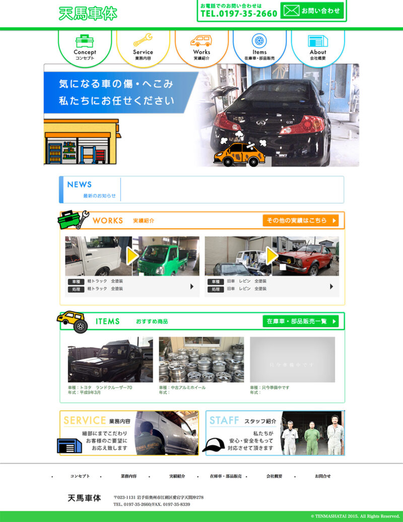 天馬車体 様 店舗の再周知を目的としたホームページを制作。 板金塗装や修理工場の暗いイメージを払拭したいとのご要望を踏まえ、明るい色合いで配色。 ポップなイラストやメインイメージに動きを加えることで、面白く親しみが持て安心してお問合せできるようなデザイン設計となっています。 URLhttp://www.tenmashatai.com/ 地域・業界・業種 奥州市 / 自動車整備・修理・販売 デバイス・仕様PC、NucleusCMS 担当業務等Webサイト設計/情報設計/デザイン/CMS構築/更新操作指導
