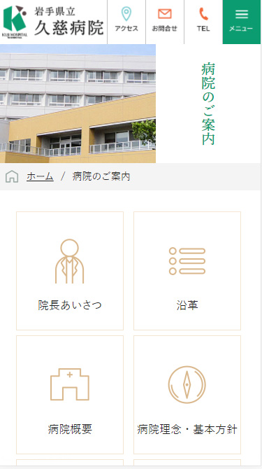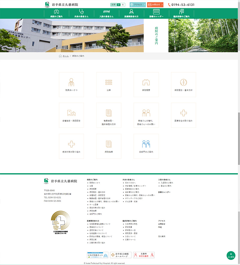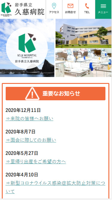 岩手県立久慈病院 様 白と緑を基調としたデザインで清潔感のあるデザイン構成。 ファーストビューではグリッドデザインを採用。 患者様にとってすぐに知りたい「診療時間」や「面会時間」、お知らせしたい重要な情報に辿り着けるようなレイアウトに。 研修医の方に向け久慈市の雰囲気が伝わるよう、ページ内には院内の写真のほか、風景写真を掲載。 URLhttp://kuji-hp.com/ 地域・業界・業種 久慈市 / 総合病院 デバイス・仕様PC、スマートフォン、WordPress 担当業務等Webサイト設計/情報設計/デザイン/CMS構築/更新操作指導