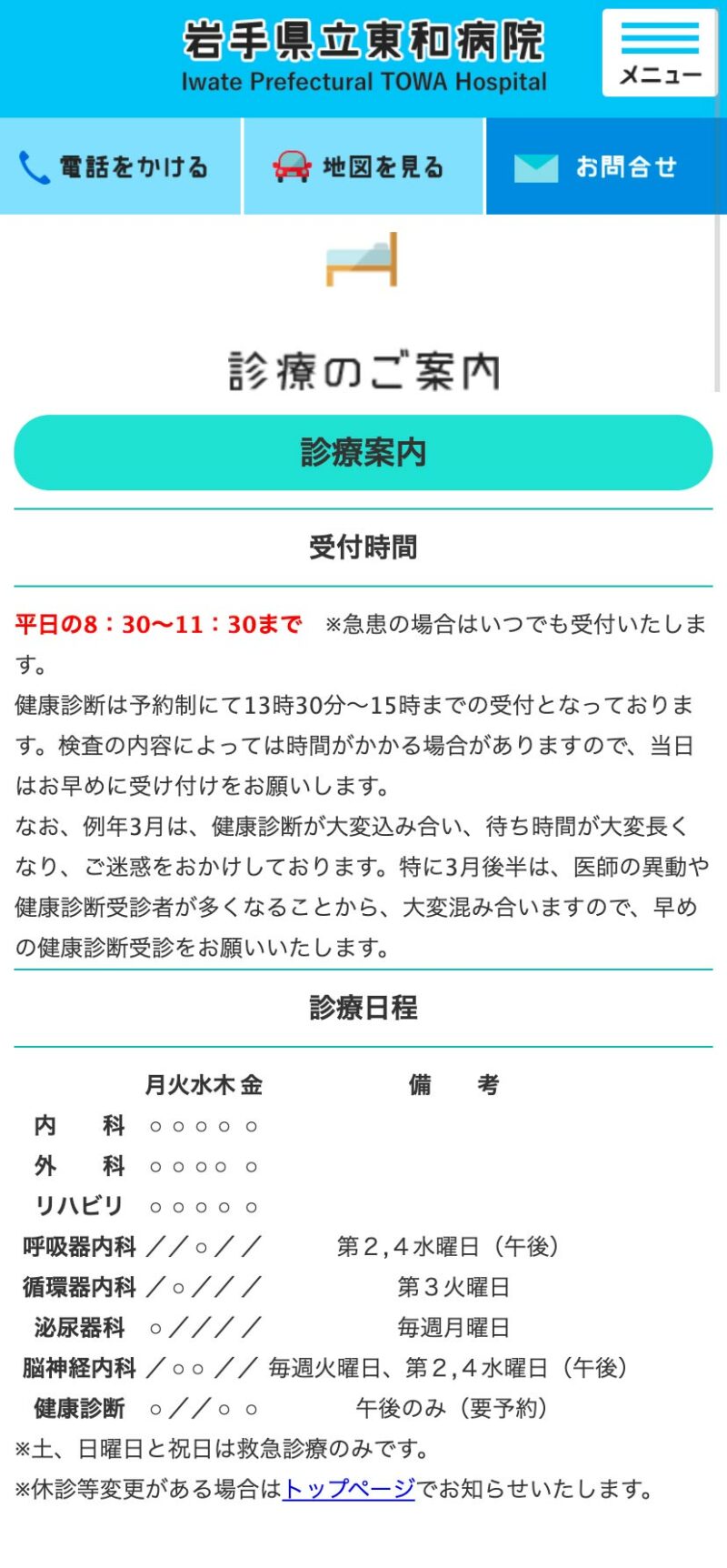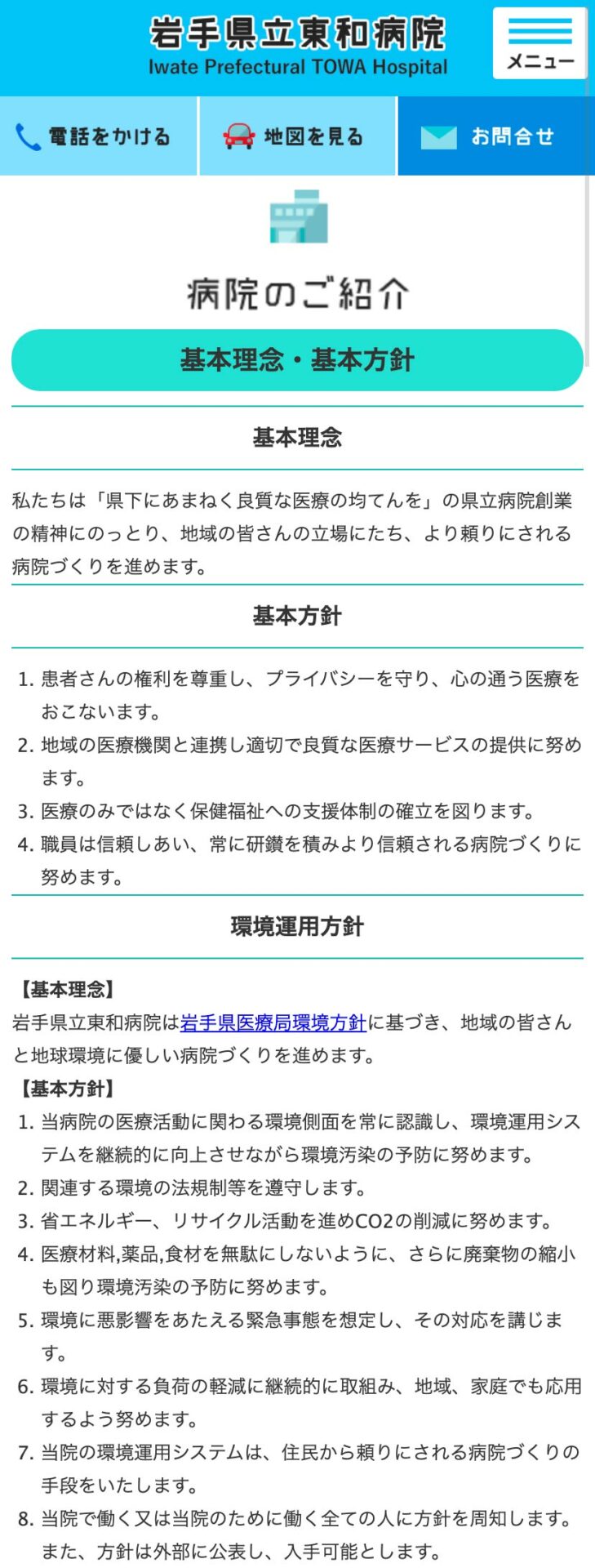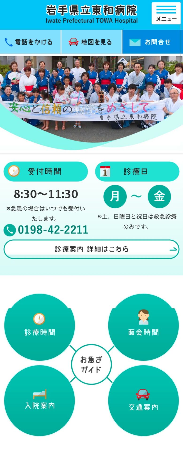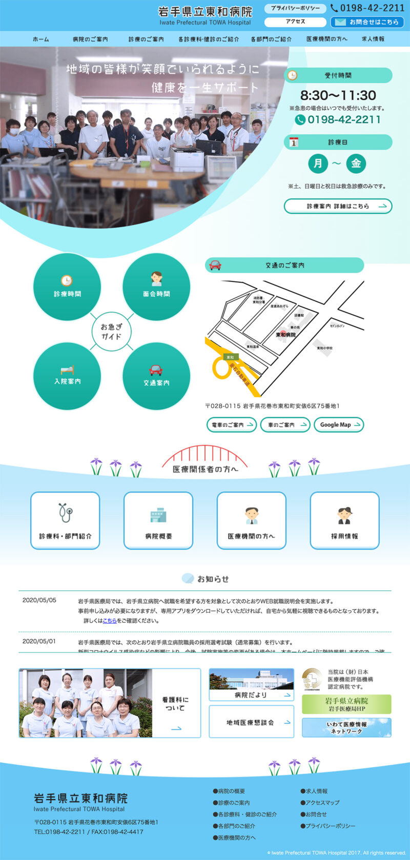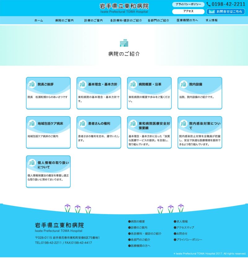 岩手県立東和病院 様 配色は白をベースとし、清潔感・誠実さを。ポイントで緑色を使用し、東和町の自然の色を表現しています。 必要なボタンを大きめに配置するなど、操作感を重視した構成に。 ファーストビューでは受付時間や診療日など簡単な情報を、そのすぐ下には一般の方が閲覧する「診療時間」「面会時間」などを1つの項目にまとめ、閲覧者が目的のページに移動できるよう作成。 東和町の花であるアヤメや田瀬湖が連想できるようなモチーフをアイコンとして作成、地域との繋がりを表現。 URLhttp://www.towa-hp.com/ 地域・業界・業種 花巻市 / 総合病院 デバイス・仕様PC、スマートフォン、NucleusCMS 担当業務等Webサイト設計/情報設計/デザイン/CMS構築/更新操作指導