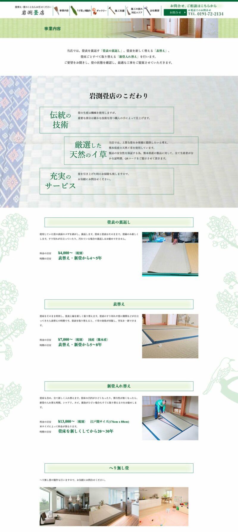 岩渕畳店 様 店舗の再周知・PRを目的としたホームページを作成。 白をベースとし、ポイントには深い緑色を採用することで、落ち着きのある厳格な雰囲気や職人らしさを表現。 実際に作業している写真やスタッフ様の顔を掲載することで、地元に根差していることや地元の畳店だからこその安心感が伝わるホームページになりました。 URLhttp://www.iwabuchi-tatami.com/ 地域・業界・業種 一関市 / 畳店 デバイス・仕様PC、NucleusCMS 担当業務等Webサイト設計/情報設計/デザイン/CMS構築/更新操作指導