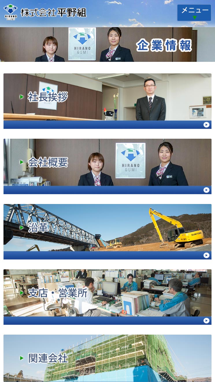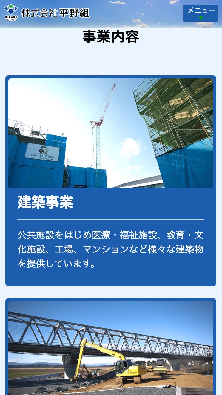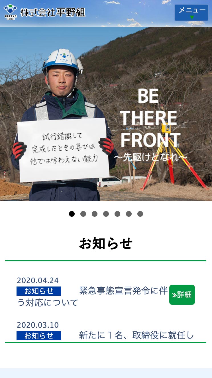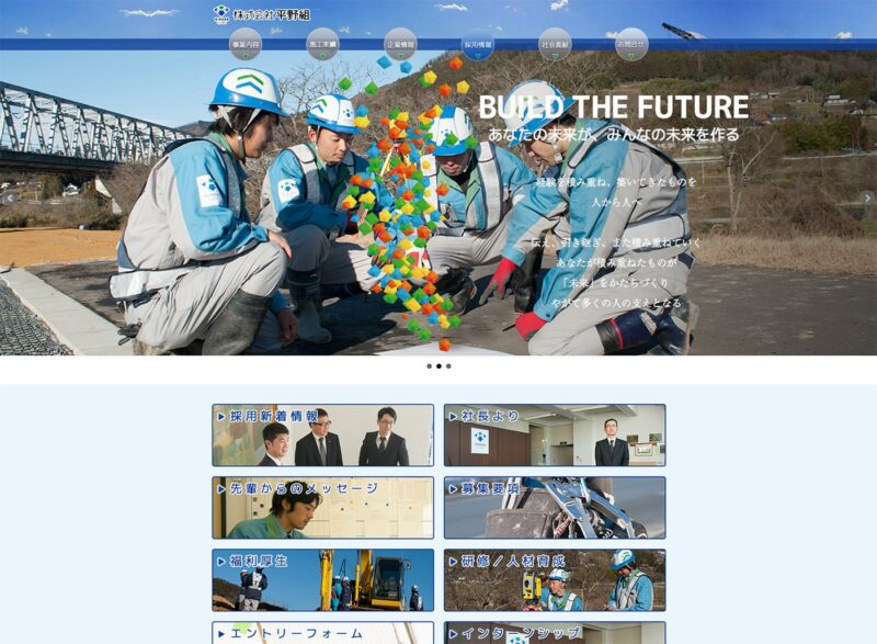 平野組 様 建築、土木をメインとする会社のPRサイト。 事業の紹介はもちろんのこと、採用の強化を目的とし、見た方がこの会社で働きたいと思ってもらえるサイトを目指しました。 スタッフ皆様の協力のもと、求職者の方へ向けたメッセージと、スタッフの写真を中心に構成。 採用関連は項目ごとのページを分け、掲載する内容も読み応えのある充実したものとなり、求職者により深く会社のこと、職場の雰囲気をを知っていただき、興味を持ってもらうきっかけとなるサイトになりました。 URLhttp://www.hiranogumi.co.jp/ 地域・業界・業種 一関市 / 建築、住宅、不動産 デバイス・仕様PC、スマートフォン、WordPress 担当業務等Webサイト設計/情報設計/デザイン/CMS構築/更新操作指導