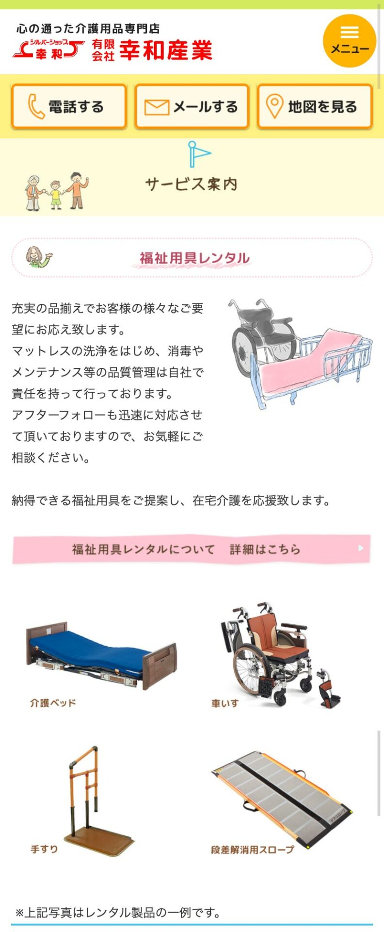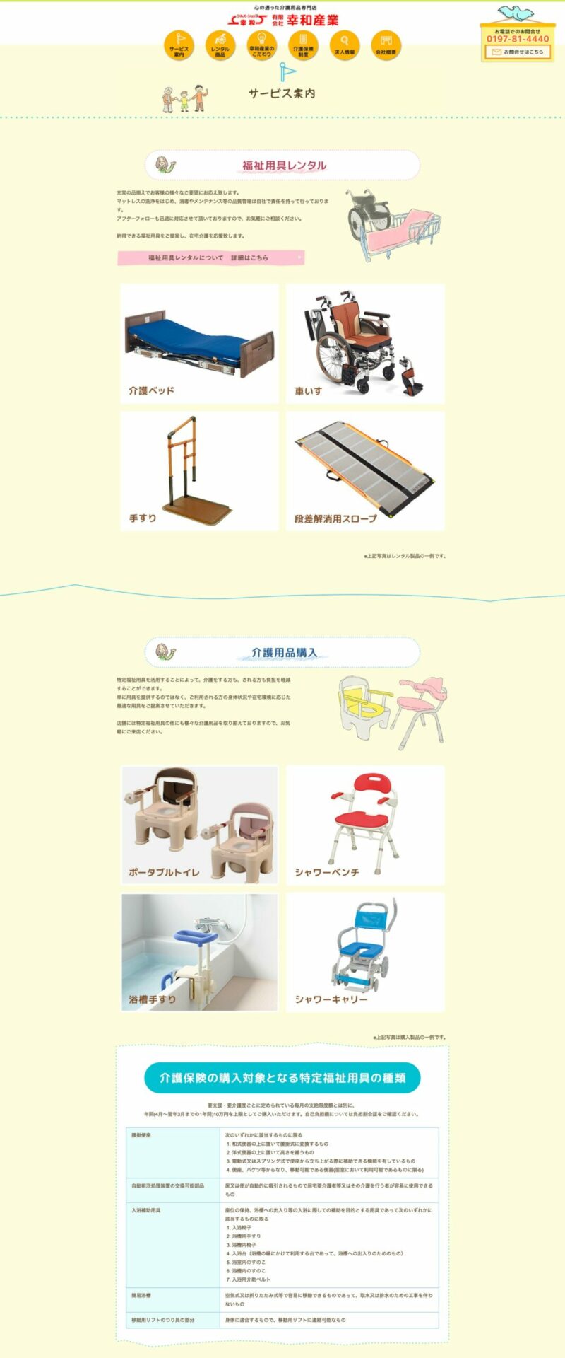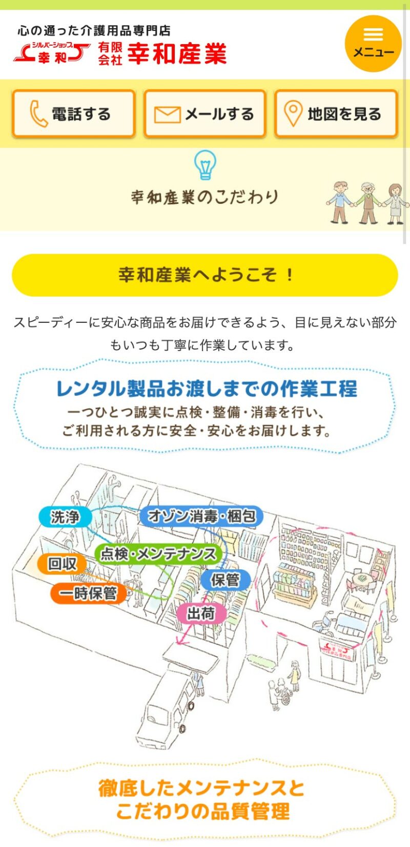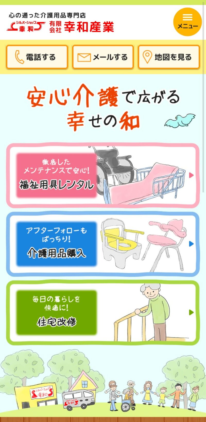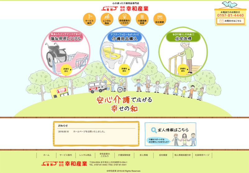 幸和産業 様 業務内容の再周知と、営業ツールとして活用したいというご要望を元にホームページを制作。 手描き風イラストをメインに、人や地域との繋がりや暖かみを感じられる柔らかいデザインテイストで作成。 全体的に手描きの要素を配置することで、親しみやすさを表現。 社員向けの専用ページを設け、営業ツールとしてご活用頂けるよう設定しています。 URLhttp://kaigowakouwa.jp/ 地域・業界・業種 北上市 / 介護用品販売 デバイス・仕様PC、スマートフォン、NucleusCMS 担当業務等Webサイト設計/情報設計/デザイン/CMS構築/更新操作指導