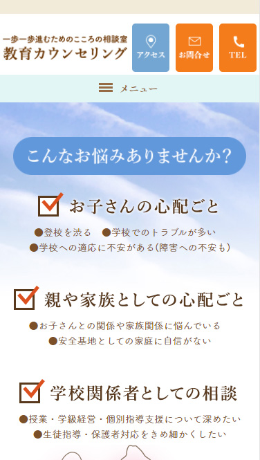 教育カウンセリング 様 全体の配色は淡い色合いを採用することで、悩み・不安に寄り添うことを表現。 また、メインビジュアルから悩みごとを掲載。読み手に共感を持たせることで、カウンセリング内容について、興味を持って見ていただけるように設置。 続けてカウンセリングのご案内として「お子さんの心配ごと」「親や家族としての心配ごと」「学校関係者としての相談」と入り口を具体例と共に設け、カウンセリング内容を明確化。 カウンセリングの特徴とお申し込みの流れを続けて掲載し、お問合せ・ご予約へと繋がる構成となっています。 電話番号・メニュー・お問合せバナーはスクロールをしても固定で表示され、どのページからでもお問合せできるよう設定。 URLhttps://kanaya-counseling.com/ 地域・業界・業種 北上市 / カウンセリング デバイス・仕様PC、スマートフォン、WordPress 担当業務等Webサイト設計/情報設計/デザイン/CMS構築/更新操作指導