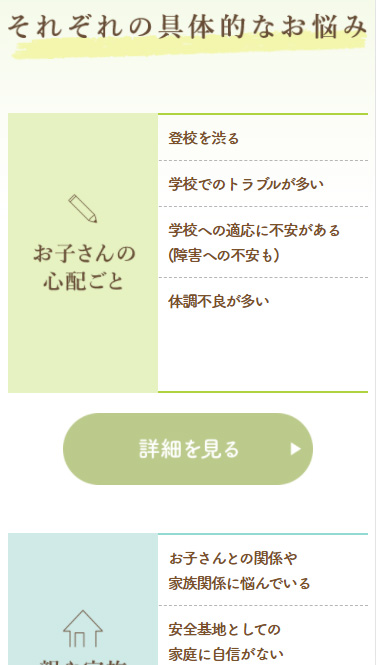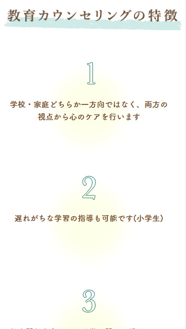 続けてカウンセリングのご案内として「お子さんの心配ごと」「親や家族としての心配ごと」「学校関係者としての相談」と入り口を具体例と共に設け、カウンセリング内容を明確化。