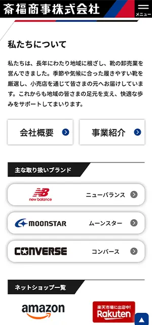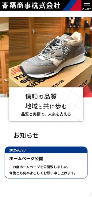 斎福商事株式会社 様 斎福商事様がこれまで粛々と事業をしてきた誠実さや実直さを表現するため、 構成をシンプルにまとめ、わかりやすさを重視して作成しました。また一般の方への案内として、ネットショップ一覧の下にマルトク靴店さんの詳細を挿入しました。 URLhttps://saifuku.net 地域・業界・業種 紫波 / シューズブランドの正規代理店事業、小売業 デバイス・仕様PC、スマートフォン、Wordpress 担当業務等Webサイト設計/情報設計/デザイン/CMS構築/更新操作指導