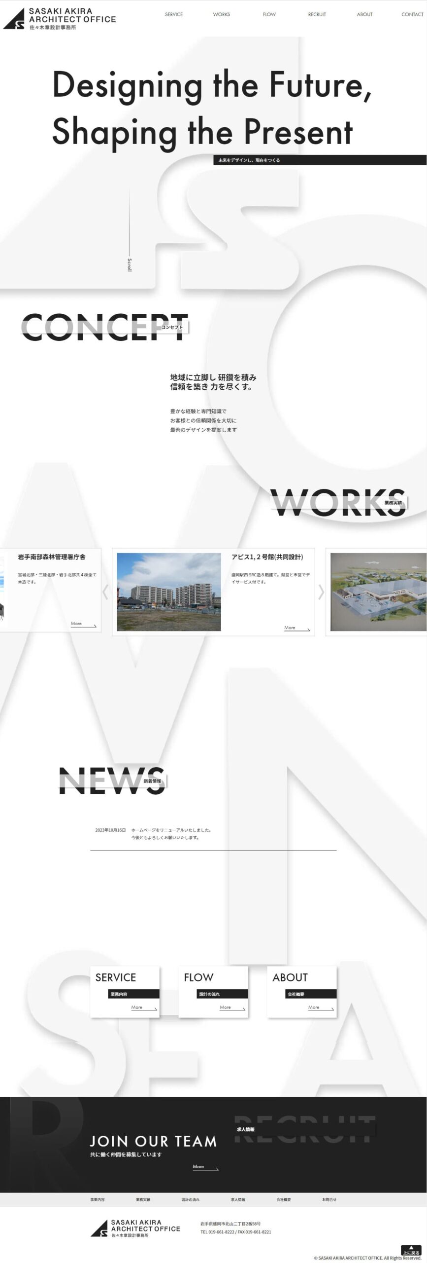有限会社佐々木章設計事務所様 様 白をベース色に採用。 加えて全体の構成はシンプルでスタイリッシュなデザインとし、洗練されたイメージを表現。 背景には、ロゴマークやアルファベットの重なりを装飾として配置。ツヤ感や奥行きを表現し、立体的な印象に。 「重なり」や「築き」を表現。 URLhttp://www.sasaki-a-arc.com/ 地域・業界・業種 盛岡市 / 設計 デバイス・仕様PC、WordPress 担当業務等Webサイト設計/情報設計/デザイン/CMS構築/更新操作指導