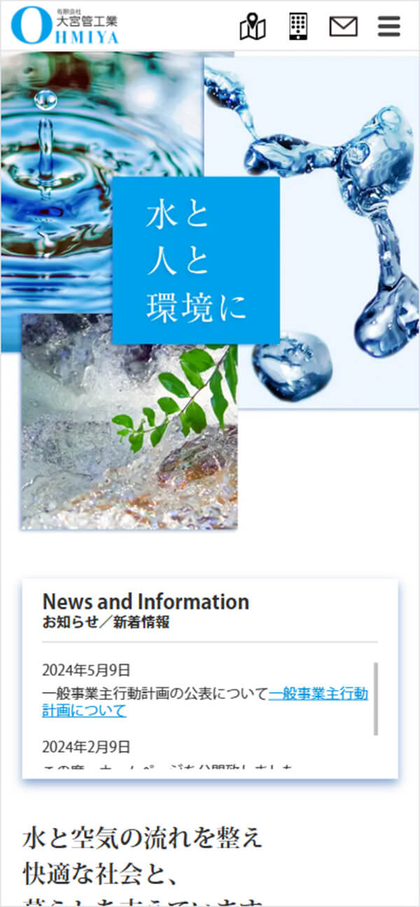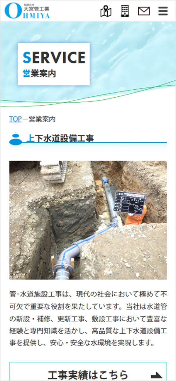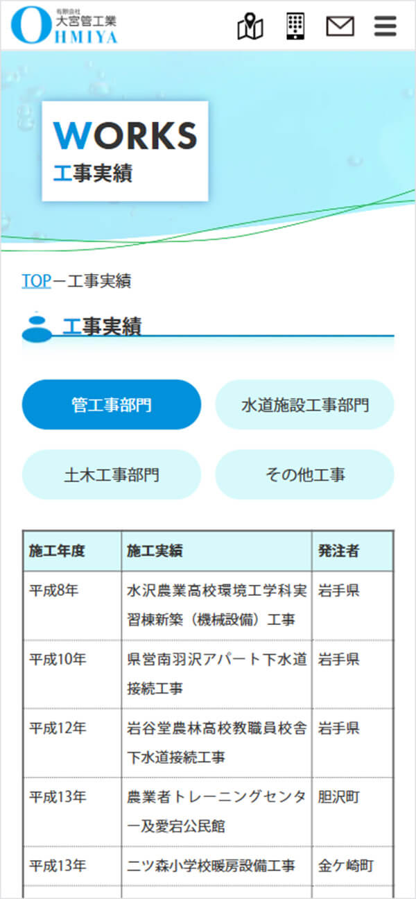 有限会社大宮管工業 様 アクセス直後の画面では、管工事で関わりの深い「水」のイメージと施工写真を織り交ぜて配置し、様々な業務を行っていることをイメージさせます。 業務案内部分でも、イラストアイコンと共に取扱業務を一覧で掲載しています。 ページ全体は白背景にブルーを差し色としたシンプルな構成で、すっきりとした印象にまとめました。 URLhttps://oomiyakankogyo.com/ 地域・業界・業種 奥州市 / 建設 デバイス・仕様PC、スマートフォン、WordPress 担当業務等Webサイト設計/情報設計/デザイン/CMS構築/更新操作指導