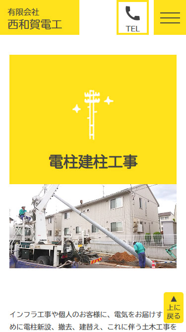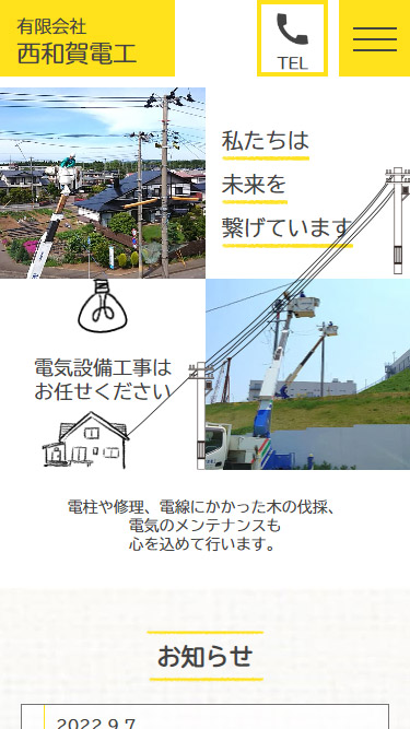 電線のイラストで視線誘導させ同時に明かりがつく演出を入れることで、西和賀電工様の明るく優しい雰囲気を伝えるサイトに。