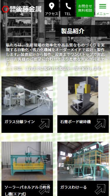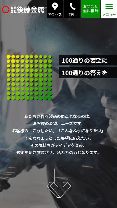 有限会社 後藤金属 様 さまざまなニーズに対しワンオフで省力化機械等を開発製造する後藤金属様のWebサイト。 その都度異なる要望に、熟練した職人技術で的確に対応する会社の姿勢を表現するため、実際に現場で作業に取り組むスタッフの姿を中心に構成。 難しい課題も解決へ導く「プロフェッショナル感」を感じさせるため、モノトーン調のシックな雰囲気に、鮮やかなグリーンとイエローを使用し、熟練した「安心感」と、豊富なイアデアから導き出される「先進性」の両方を感じさせるよう考慮しました。 URLhttp://gotokin.net/ 地域・業界・業種 奥州市 / 機械設備製造 デバイス・仕様PC、スマートフォン、WordPress 担当業務等Webサイト設計/情報設計/デザイン/CMS構築/更新操作指導
