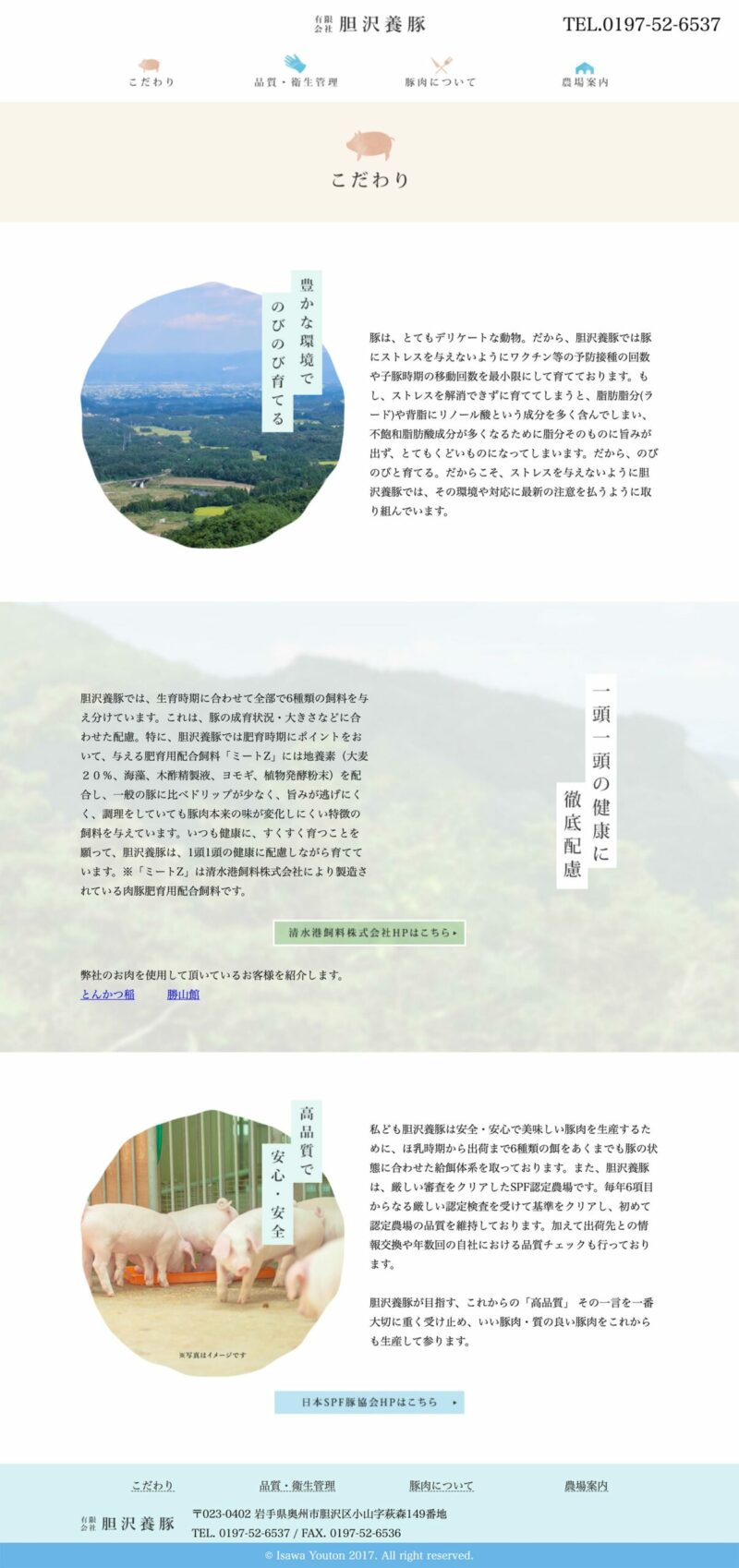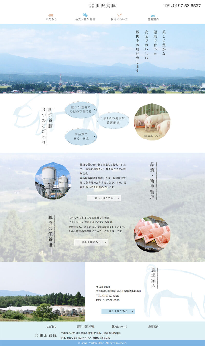 有限会社 胆沢養豚 様 会社イメージアップや品質の良さをPRしたホームページを作成。 養豚場周辺の広大な風景写真を大きく掲載。恵まれた環境下で飼育を行なっているということを風景写真で伝えています。 白を基調としたシンプルなイメージで清潔感が感じられるように仕上げています。 URLhttp://www.isawayoton.com/ 地域・業界・業種 一関市 / 養豚業 デバイス・仕様PC、NucleusCMS 担当業務等 Webサイト設計/情報設計/デザイン/CMS構築/更新操作指導