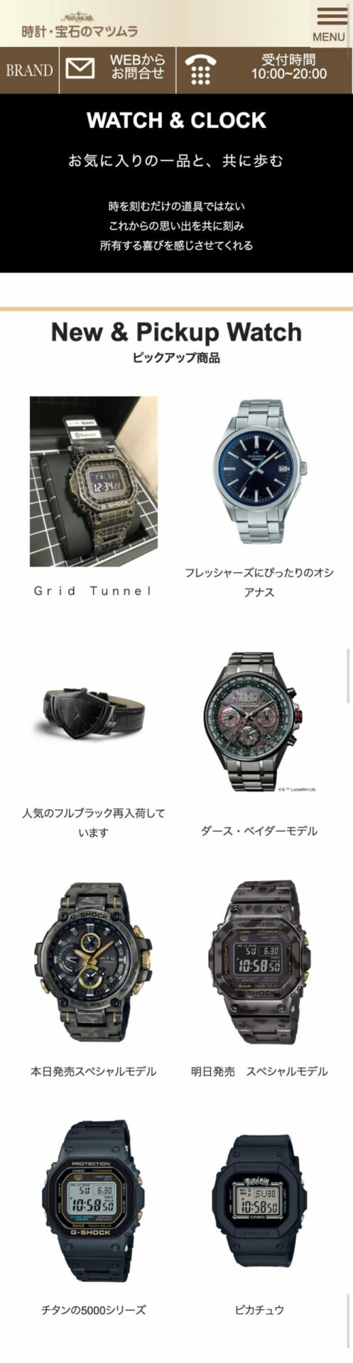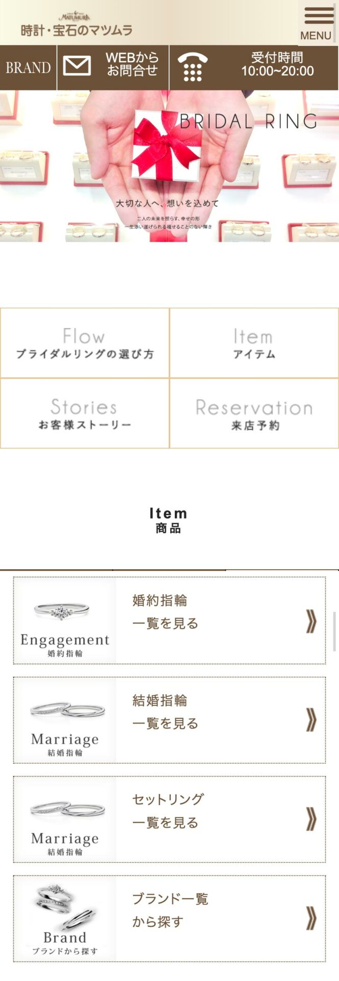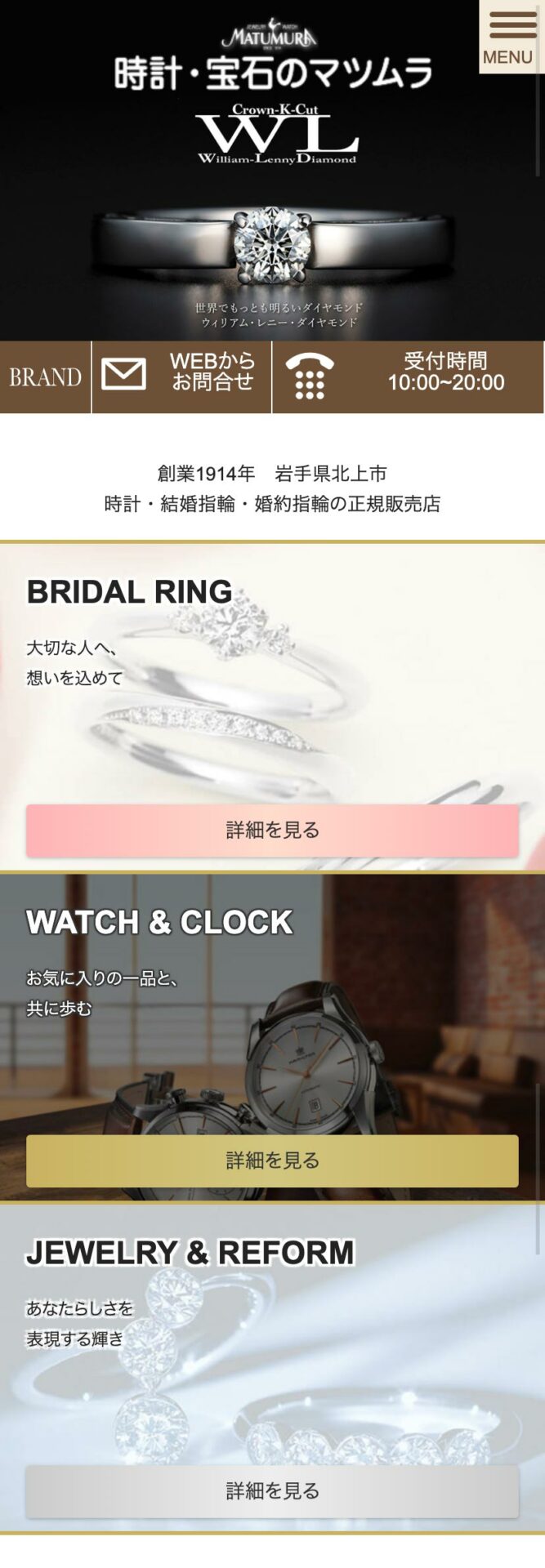 松村時計店 様 創業から、長年地域に密着して歩んできたということを、伝統を感じられるようシックで落ち着いた雰囲気に仕上げ表現。 白をベースに洗練されたイメージで、ブランドや高級感が感じられるデザイン設計に。 時計・ブライダル・ジュエリーと取扱商品のカテゴリーをトップページから大きく掲載し、入り口を分かりやすく設けています。 URLhttp://www.matsumura-tokeiten.com/ 地域・業界・業種 北上市 / 時計・結婚指輪・婚約指輪・宝石店 デバイス・仕様PC、スマートフォン、NucleusCMS 担当業務等Webサイト設計/情報設計/デザイン/CMS構築/更新操作指導