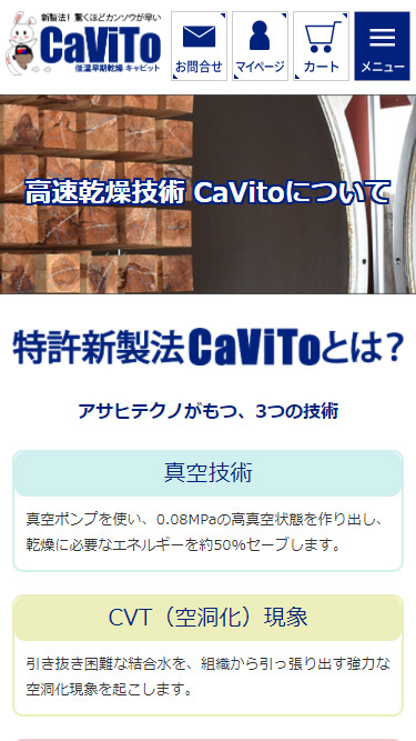 建設工法をベースに開発された新しい低温早期乾燥技術『CaViTo(キャビット)』のプロモーションサイト。