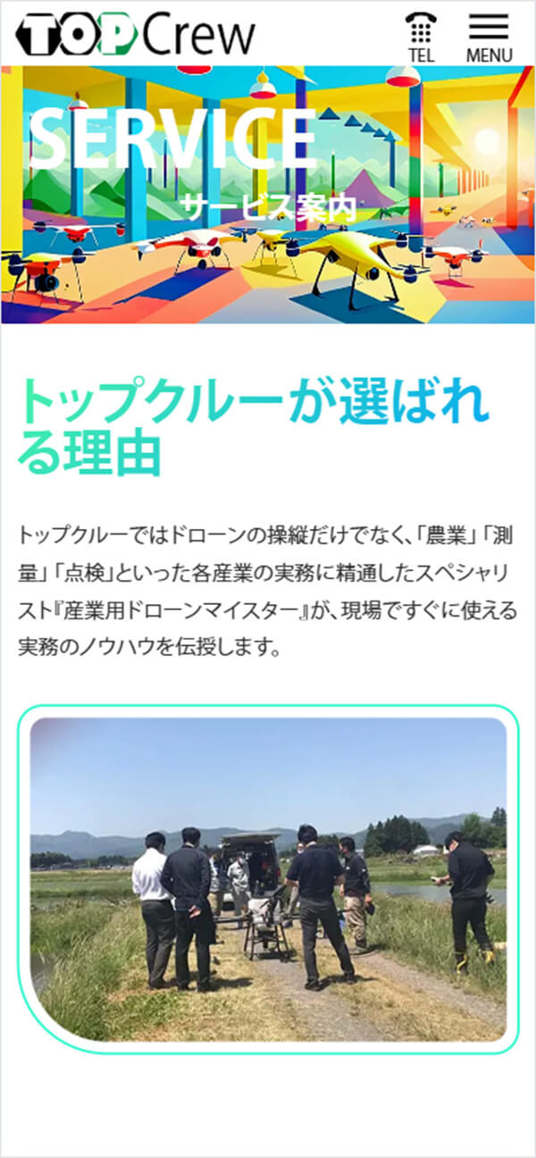 株式会社トップクルー 様 様々な仕事の現場で活躍するドローンのイメージをイラストで掲載。 最初の画面のキャッチフレーズを、より具体的なイメージにするため、スクロール直後では大きく2つ目のキャッチフレーズを掲載。事業の強みをアピールしています。 画面いっぱいにイラストを配置した最初の画面と、対比的に白面を活かした画面の両方使用することで、見る人が飽きずに、ページを最後まで見てもらえるよう考慮しました。 URLhttps://drone.iwate.jp/ 地域・業界・業種 花巻市 / ドローンスクール、販売 デバイス・仕様PC、スマートフォン、WordPress 担当業務等Webサイト設計/情報設計/デザイン/CMS構築/更新操作指導