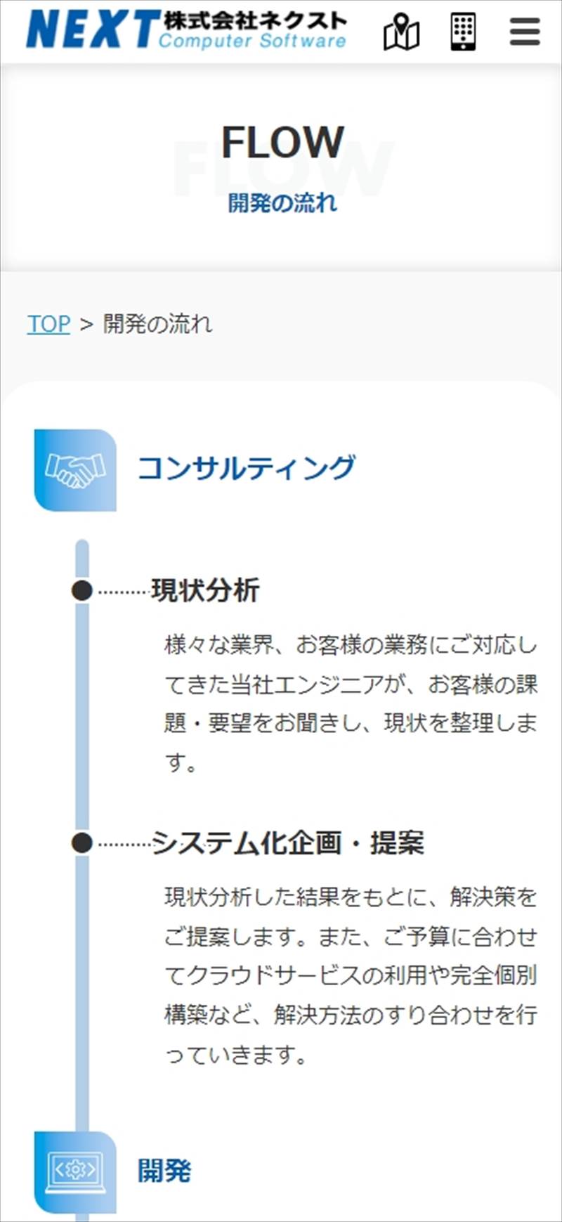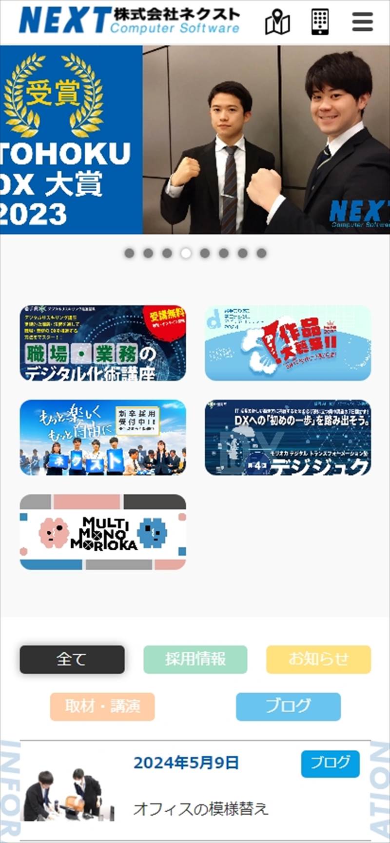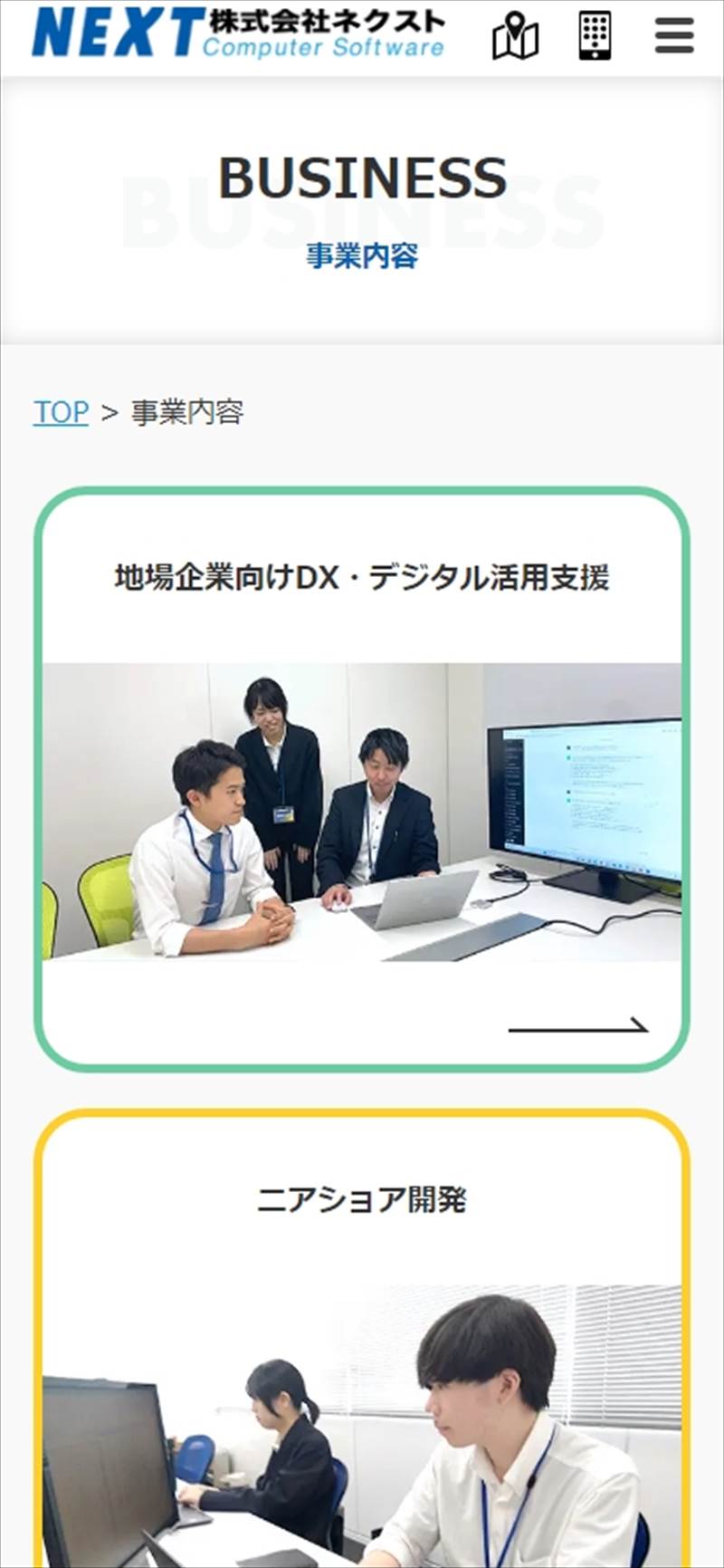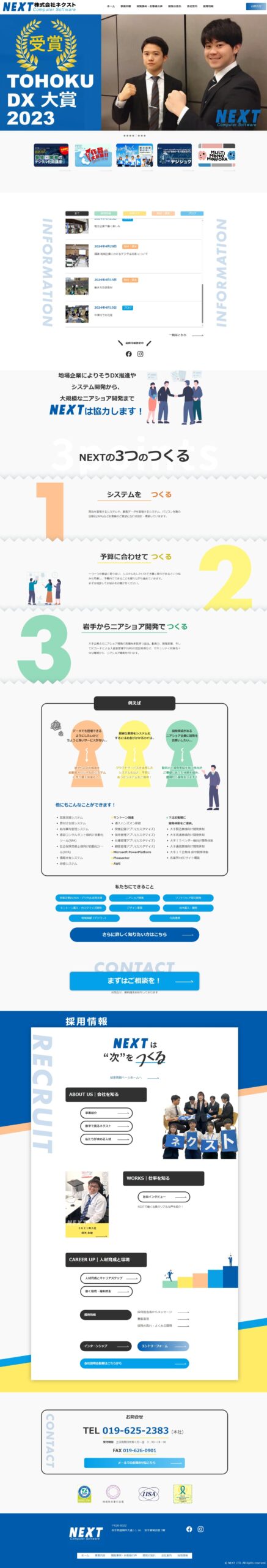 株式会社ネクスト 様 アクセス直後の状態では、画面幅いっぱいにイメージ画像を配置したシンプルな構成。 「つくる」をコンセプトに楽しげで前向きな気持ちになれるようなデザイン案。 ポップすぎないよう色を少し落ち着いた色で統一、システム開発の硬いイメージではなく柔軟に対応できるような印象に。 特徴を大きく3 つ掲載することで、NEX T様に依頼することのメリットをわかりやすくキャッチーにアピール。 また採用情報を大きく入れることで求職者がアクセスしやすくなるように工夫。 URLhttps://www.next-ltd.jp/ 地域・業界・業種 盛岡市 / ソフトウェア開発 デバイス・仕様PC、スマートフォン、WordPress 担当業務等Webサイト設計/情報設計/デザイン/CMS構築/更新操作指導
