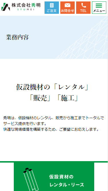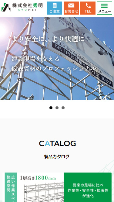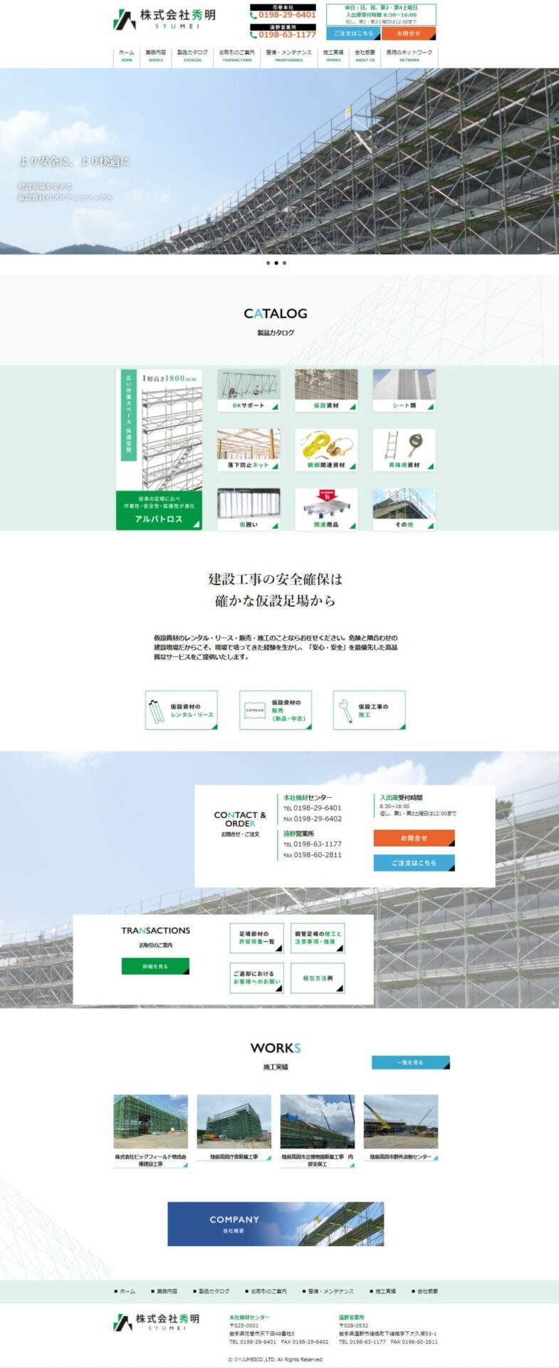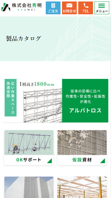 株式会社秀明 様 会社案内を意識したデザイン設計とし、背景色は清潔感を感じられる白を採用。ポイントに会社カラーである青と緑色、お問合せなど目立つべき部分にはオレンジを使用。 足場を線のみのイラストで作成し、写真と交互に掲載することで乱雑さを排除。 取引先企業様へ向けたシンプルでわかりやすい構成としています。 製品カタログのカテゴリー一覧をトップページから掲載し、閲覧者が欲しい情報へとすぐ辿り着けるよう作成。メイン商品であるアルバトロスは項目を大きく設け、特徴を簡潔に説明し目立たせています。 URLhttp://www.syuumei-iwate.jp/ 地域・業界・業種 花巻市 / 仮設資材 レンタル・リース及び販売 デバイス・仕様PC、スマートフォン、WordPress 担当業務等Webサイト設計/情報設計/デザイン/CMS構築/更新操作指導