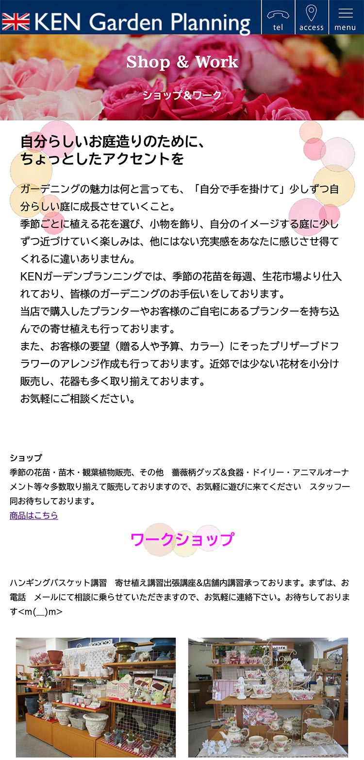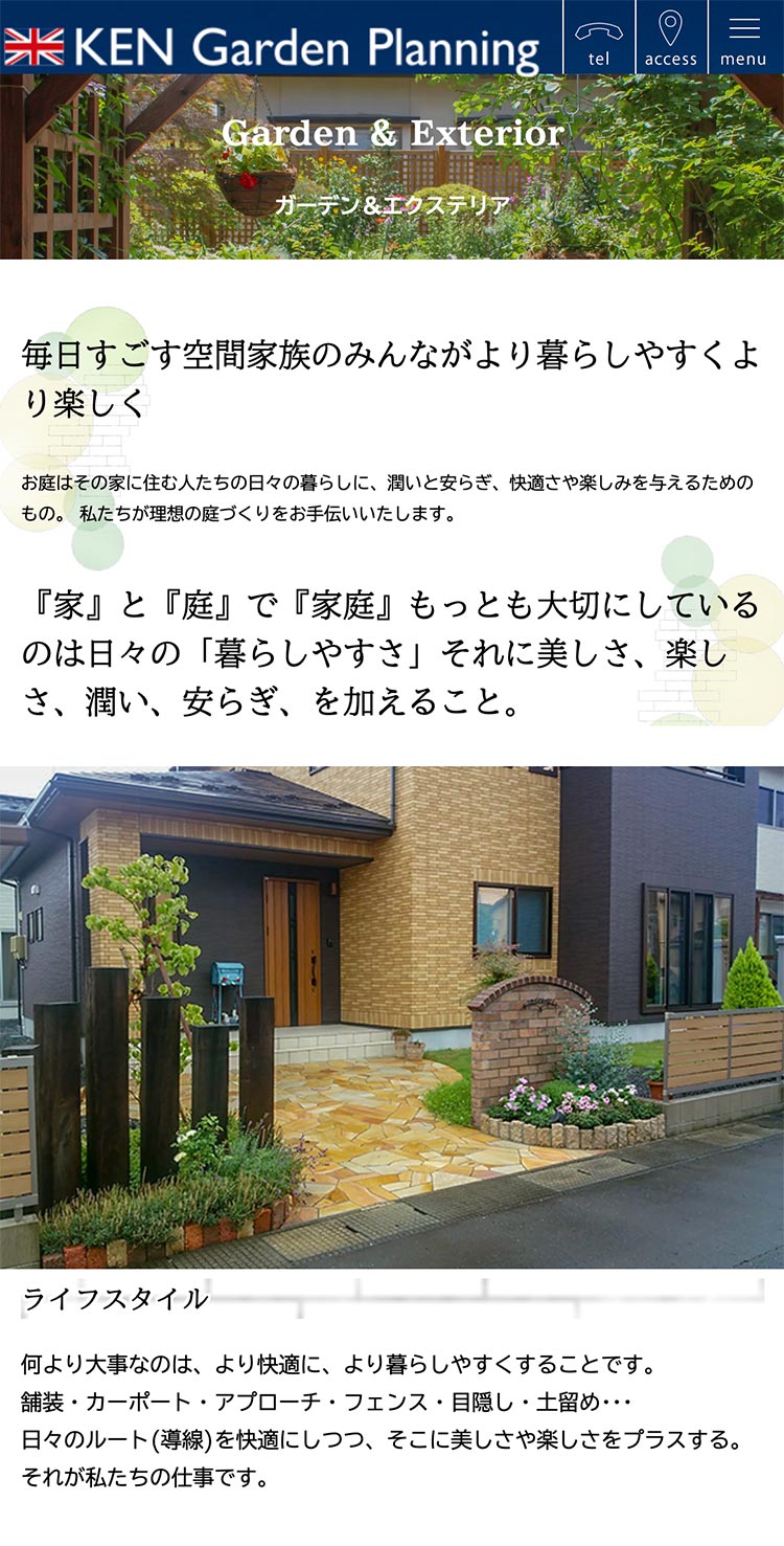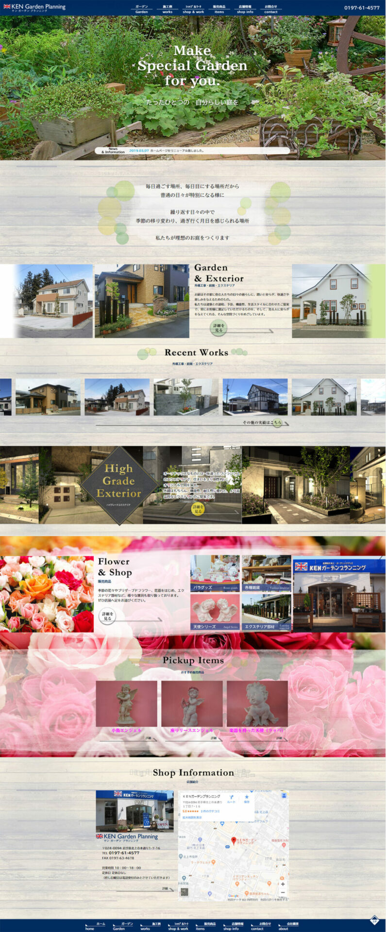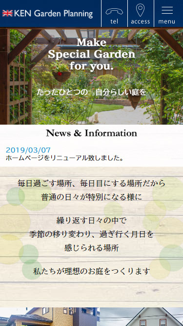 株式会社 丸重 KENガーデンプランニング 様 シンプルな構成に、コンパクトにまとめたナビゲーションと大きくキャッチコピーを配置したレイアウト。 施工例の写真を前面に配置し、何よりも作品(施工例)を見て、魅力を感じ、興味を持ってもらえるような構成としました。 メインスライドの下には、コンセプトを掲載。 周囲に造園の平面図をイメージしたパーツを配置。 人の手のぬくもりや、自然(植物)の変化する様を イメージして、ムラのある塗り色と、かすれた線で表現しました。 URLhttp://ken-gardenplaning.com/ 地域・業界・業種 北上市 / 庭園の設計・施工 デバイス・仕様PC、スマートフォン、WordPress 担当業務等Webサイト設計/情報設計/デザイン/CMS構築/更新操作指導