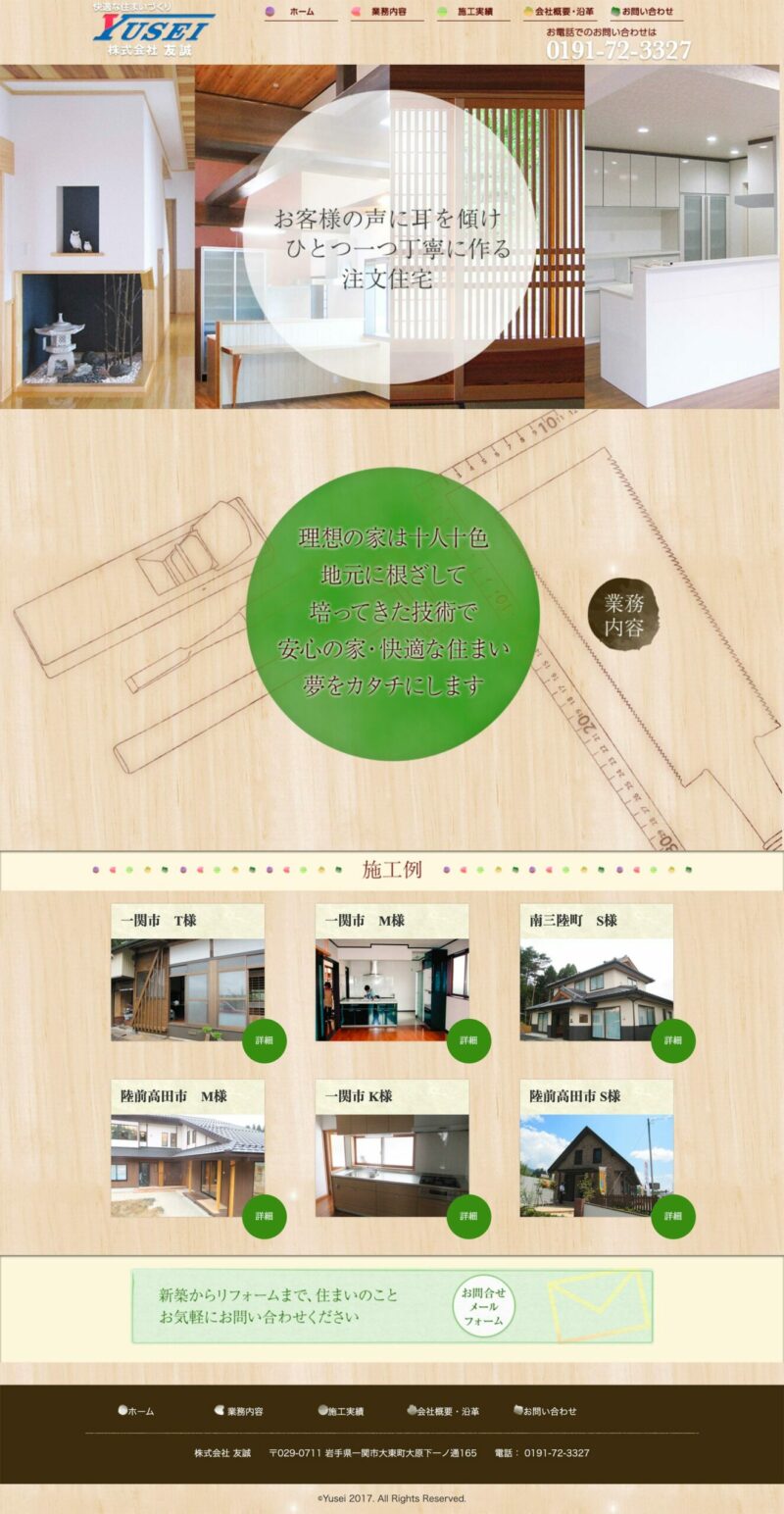 株式会社 友誠 様 地域密着で住まいづくりを行う工務店、株式会社友誠様のWebサイト。 地元ならでは安心感を表現するため、木目調の背景に、手書き風に加工した画像を使用し、人の手のぬくもりや、暖かさを感じさせるデザインを目指しました。 これまでに携わったを施工例を見てもらいたいという希望から、トップページにも施工実績の写真を配置。個々の施工例ページでも、多数の写真を掲載できる構造としました。 URLhttp://www.yuusei-ichinoseki.com/ 地域・業界・業種 一関市 / 工務店 デバイス・仕様PC、NucleusCMS 担当業務等Webサイト設計/情報設計/デザイン/CMS構築/更新操作指導