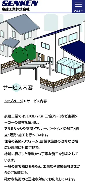 泉建工業株式会社 様 地域に根ざした外まわりの専門企業としての信頼感と、親しみやすさを両立したトップページデザインです。 六角形のモチーフを用いることで堅実さと柔軟性を表現。写真とイラストをバランスよく配置し、施工内容や雰囲気を視覚的に伝えます。 サービス部分ではイラストを使い、一般の方にもどの部分かをすぐわかるようにしました。 URLhttps://senkenkogyo.jp 地域・業界・業種 遠野市 / 建設業 デバイス・仕様PC、スマートフォン、WordPress 担当業務等Webサイト設計/情報設計/デザイン/CMS構築/更新操作指導