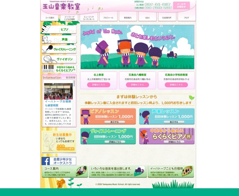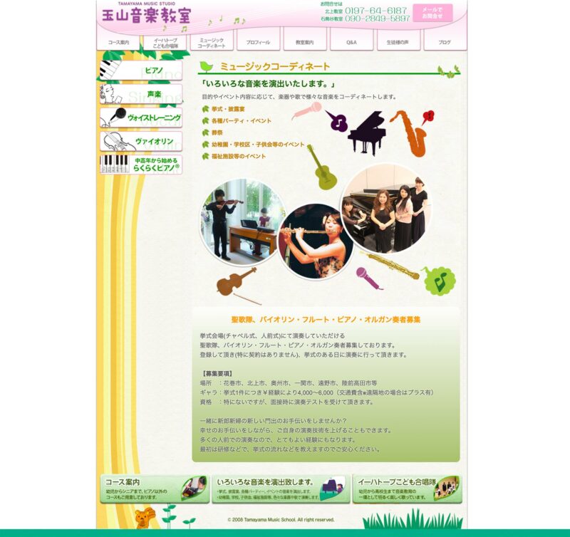 ピアノ、声楽、ボイストレーニング、バイオリンなどを指導する玉山音楽教室様のホームページ。