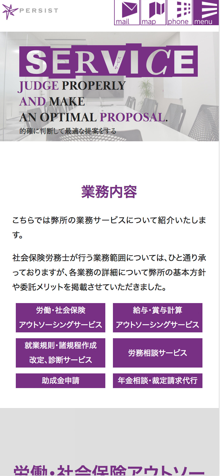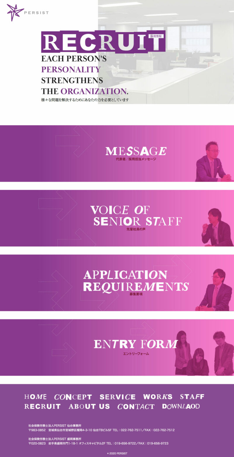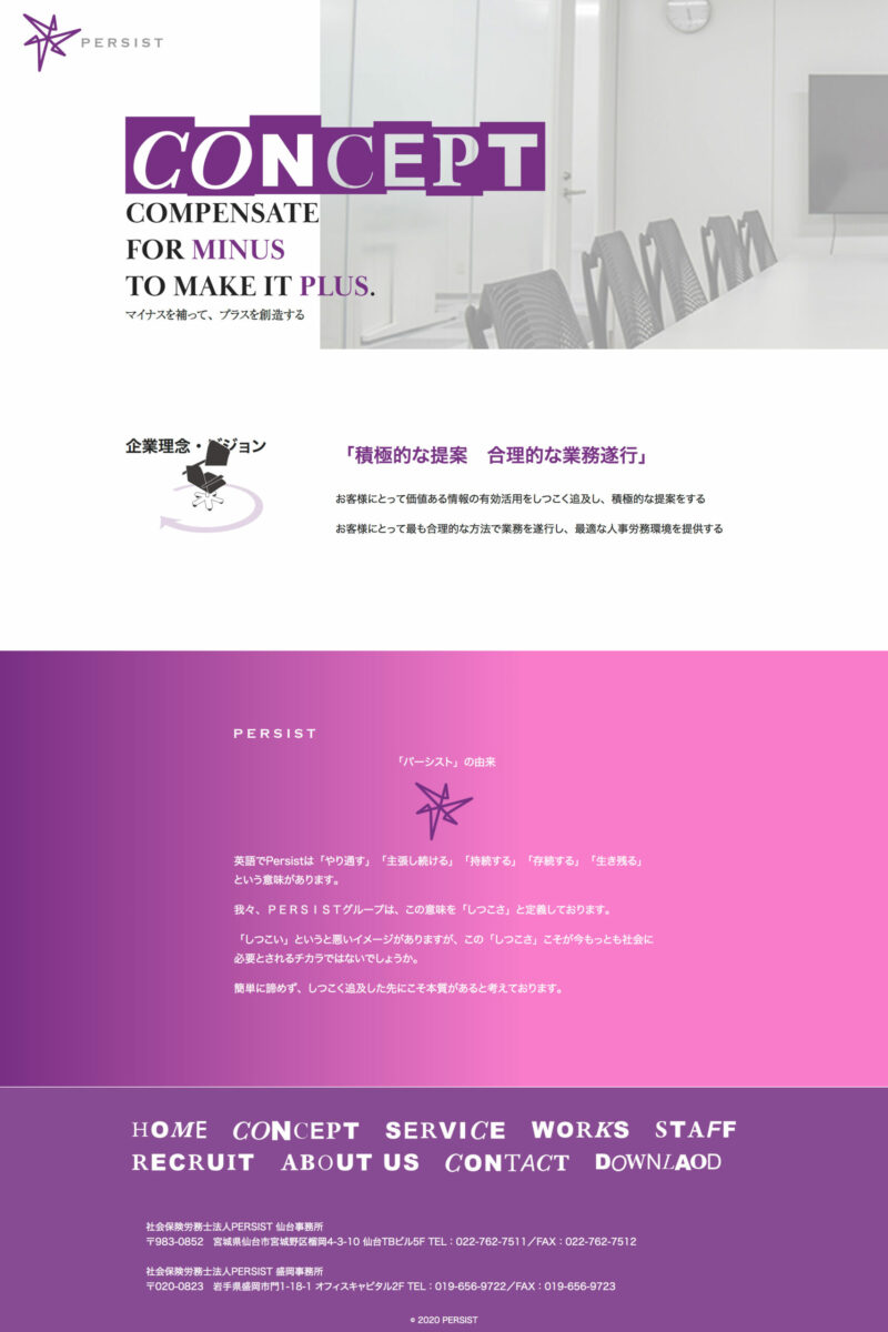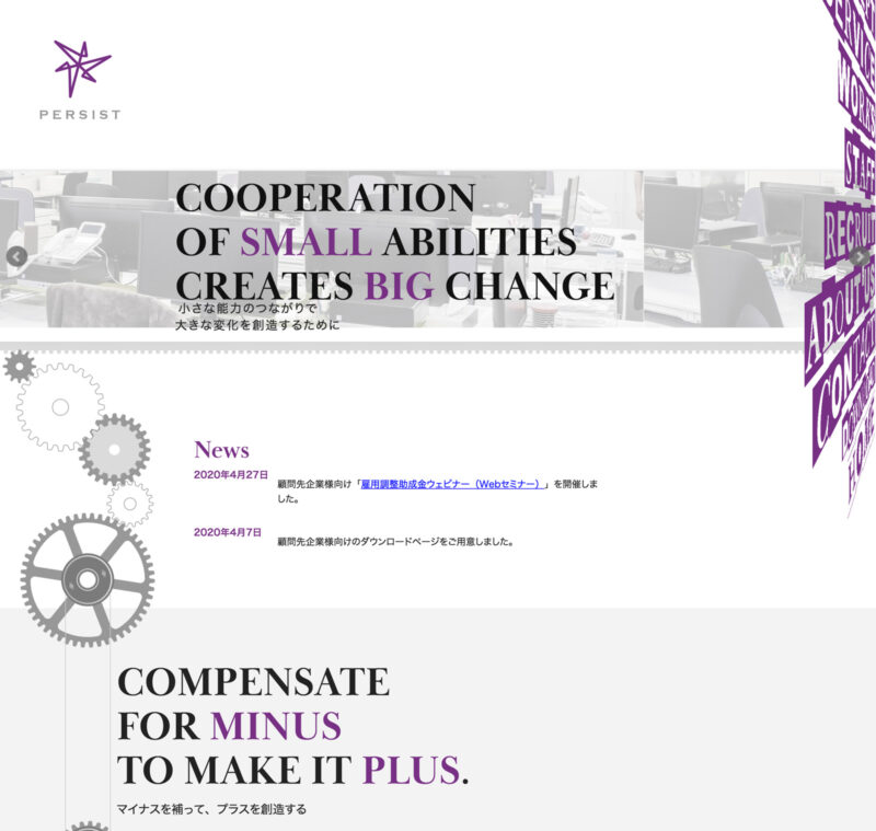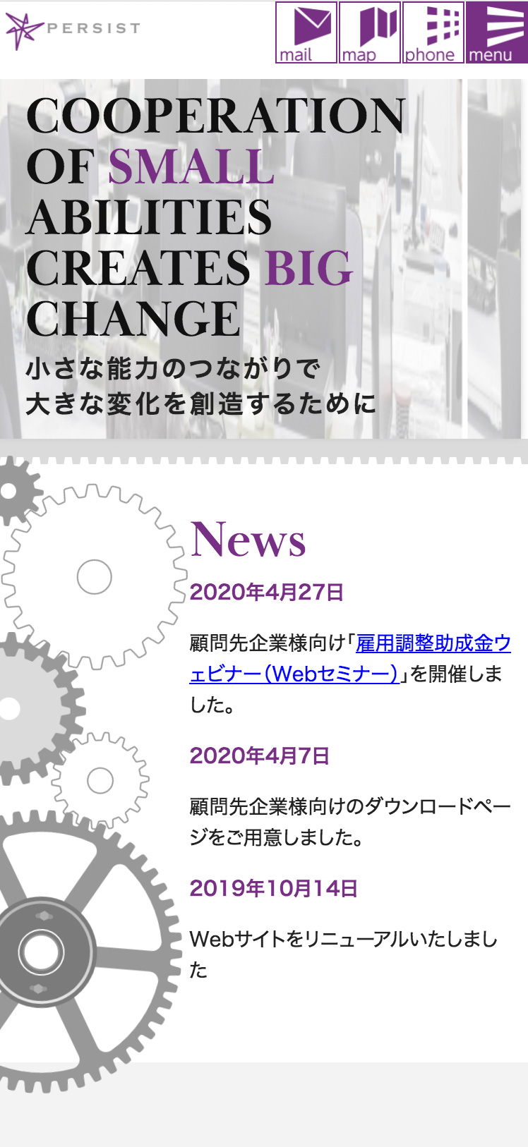 社会保険労務士法人PERSIST 様 ナビゲーション部分は、不揃いな書体を組み合わせることで、「型にはまらない」「自由な雰囲気」を表現しました。 また、回転する歯車やダイヤル、メーターなどのイメージで、様々な要素が連携して物事を動かす力になるイメージを表現。 トップページは、「初期画面」「コンセプト」「サービス」「採用情報」「スタッフ」の、各項目毎に、ユーザーの操作に応じて反応するアクション(動き)を、加えて閲覧者の興味を引くと共に、他の士業系Webサイトにありがちな堅苦しさを払拭します。 URLhttps://persister.jp/ 地域・業界・業種 宮城県 / 社会保険労務士法人 デバイス・仕様PC、スマートフォン、WordPress 担当業務等Webサイト設計/情報設計/デザイン/CMS構築/更新操作指導