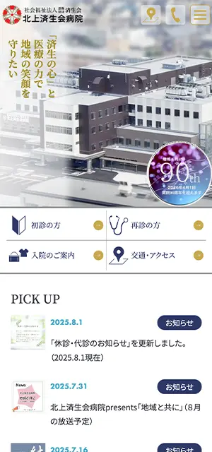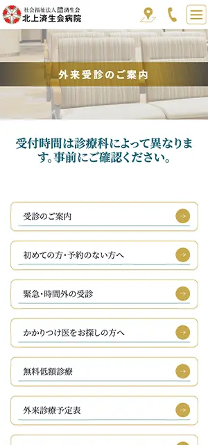社会福祉法人恩賜財団 北上済生会病院 様 白をベース色に採用し、清潔感を表現。 また、ポイントの配色はピンクを主軸に、明るいオレンジ、黄緑、水色、赤を採用し、るく楽しい雰囲気が感じられるデザインとなっています。 ページ構成としては施設やサービスの様子が伝わるよう、外観・内観・スタッフ様の写真を掲載していきます。 「診療」~「障がい者支援」までのメインとなる 5 ページは、メインイメージ下部に目立つようにメガメニューとして配置。 各項目をクリックすることで、詳細ページへの入り口が簡単な説明と共に表示されます。閲覧者の欲しい情報がどこにあるのか、迷わず辿り着ける構成となっています。 URLhttps://www.saiseikai-hp.or.jp 地域・業界・業種 北上市 / 総合病院 デバイス・仕様PC、スマートフォン、WordPress 担当業務等Webサイト設計/情報設計/デザイン/CMS構築/更新操作指導