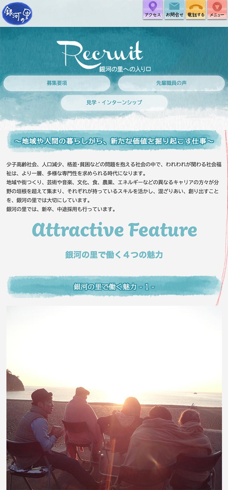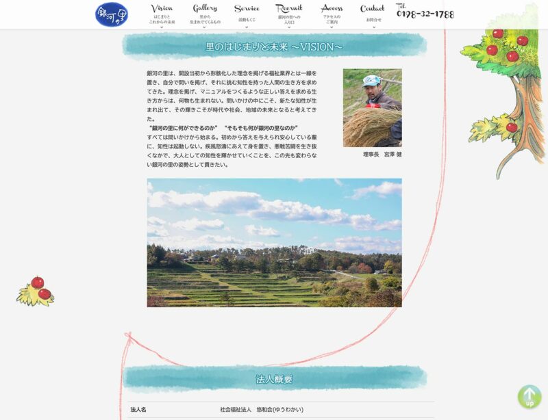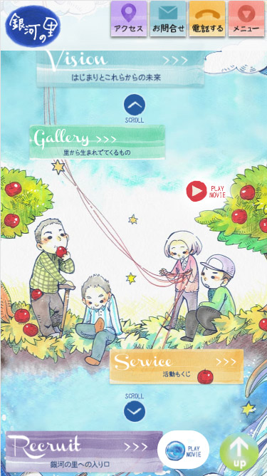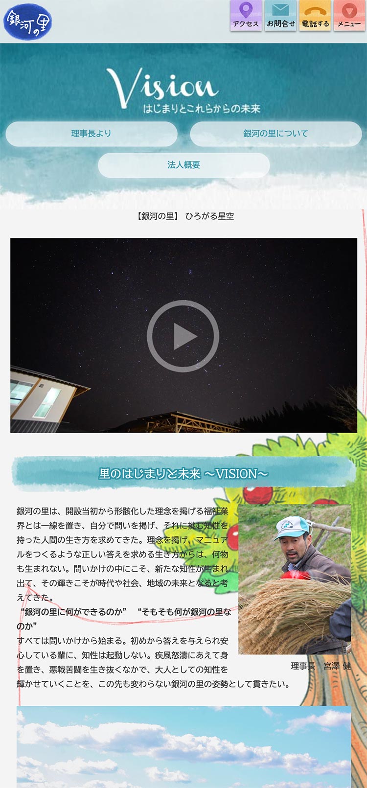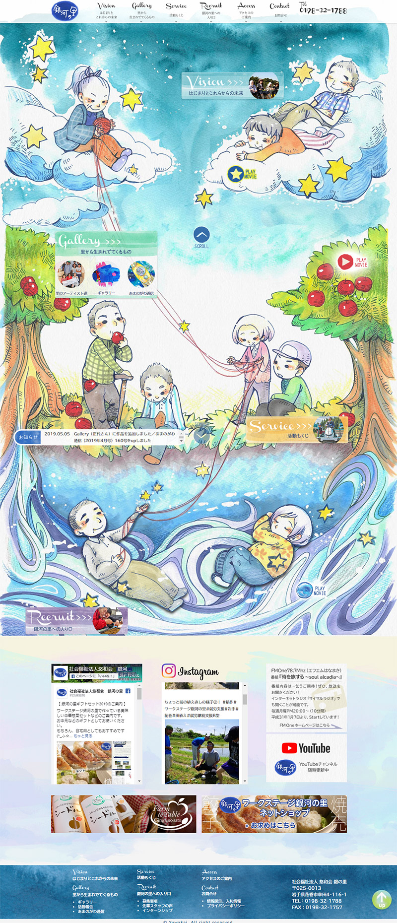 社会福祉法人 悠和会 銀河の里 様 ご提供いただいたイラストの世界観がそのまま画面の中で動き出すイメージで、背景や各種パーツ類も、画用紙の様な質感に手書き風の塗り色や書体を使用し、全体に統一感が出る様考慮しました。 メインナビゲーション部分は、モノクロのシンプルな構成にすることで、他の部分との差をつけ、目につきやすくしました。 また、スクロール操作に合わせ、各所で、様々な動きが発生し、閲覧者の視線を誘導します。 URLhttp://www.ginganosato.com/ 地域・業界・業種 花巻市 / 高齢者福祉事業・障がい者支援事業 デバイス・仕様PC、スマートフォン、WordPress 担当業務等Webサイト設計/情報設計/デザイン/CMS構築/更新操作指導
