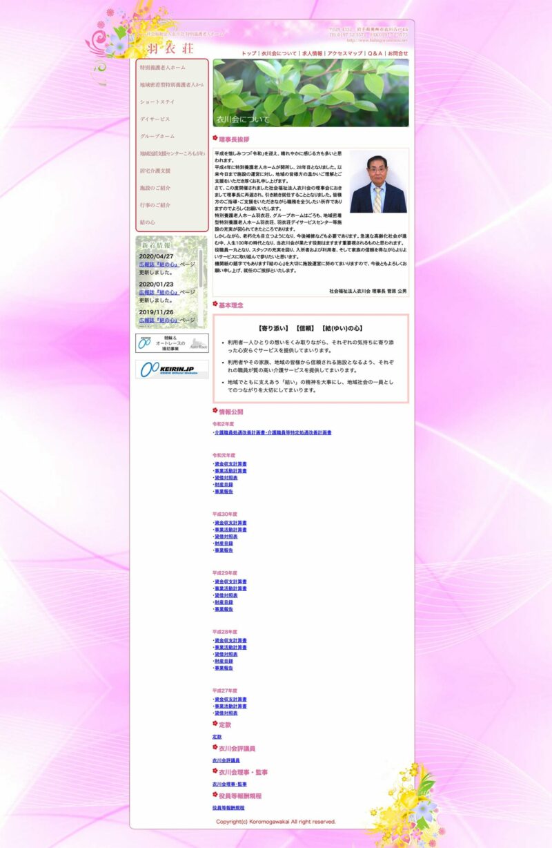 社会福祉法人 衣川会 様 URLhttp://www.hagoromosou.net/ 地域・業界・業種 奥州市 / 福祉、福祉施設 デバイス・仕様PC、NucleusCMS 担当業務等Webサイト設計/情報設計/デザイン/CMS構築/更新操作指導