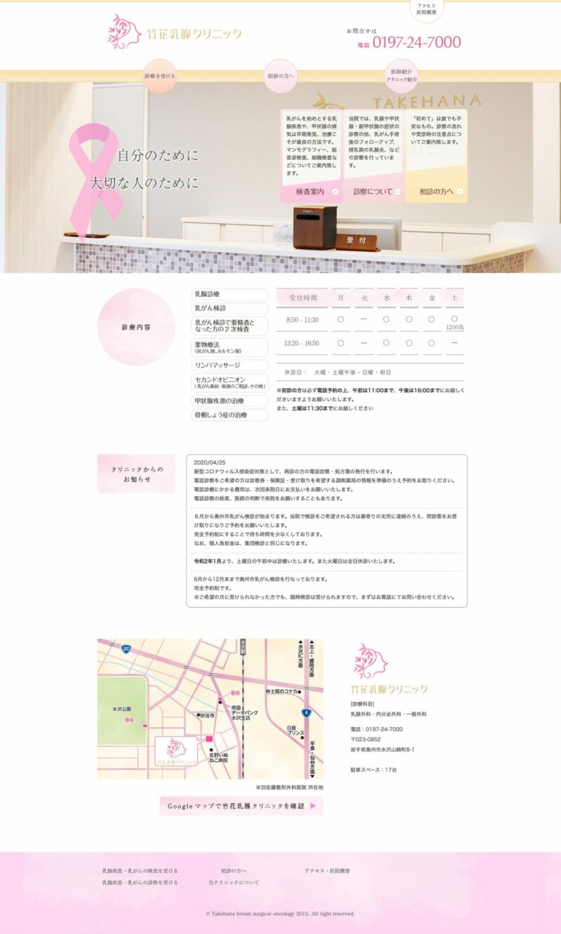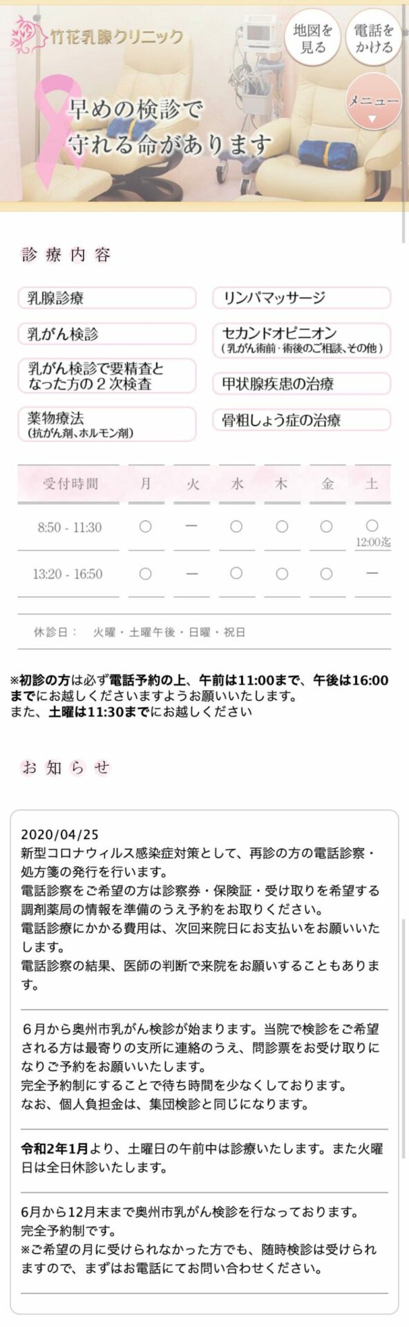 竹花乳腺クリニック 様 URLhttp://www.takehana-cl.com/ 地域・業界・業種 奥州市 / 乳腺診療 デバイス・仕様PC、スマートフォン、NucleusCMS 担当業務等Webサイト設計/情報設計/デザイン/CMS構築/更新操作指導