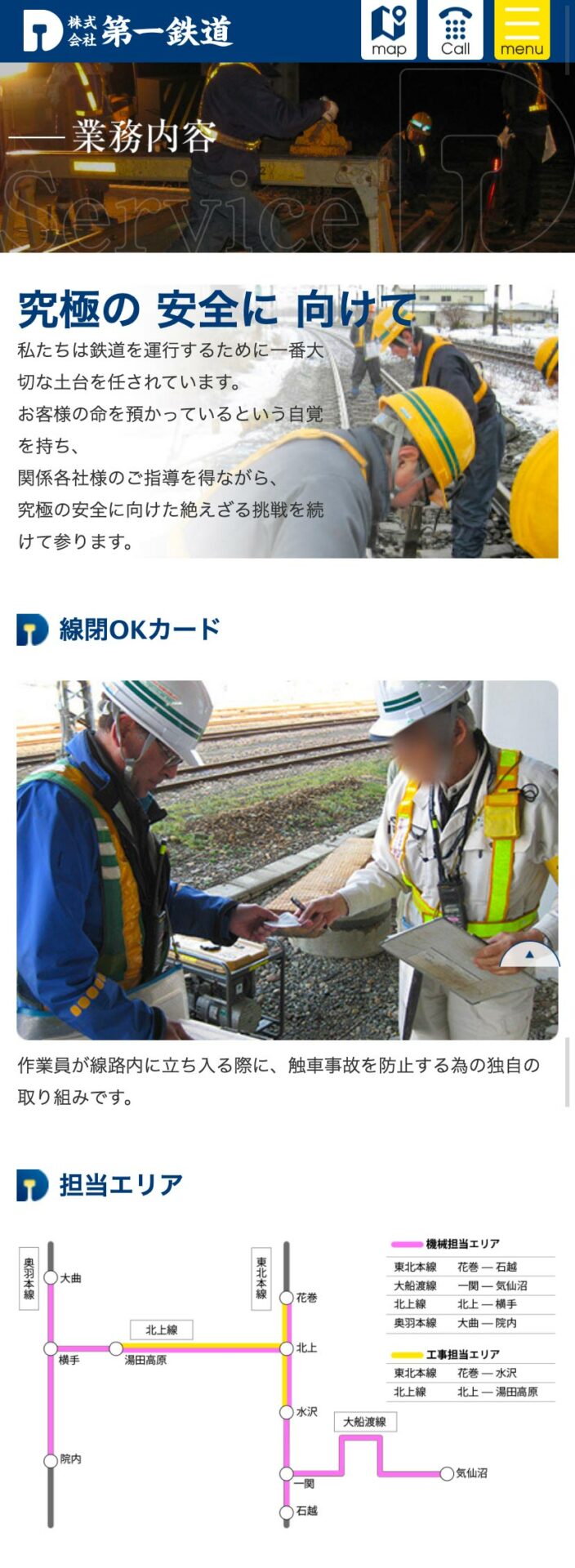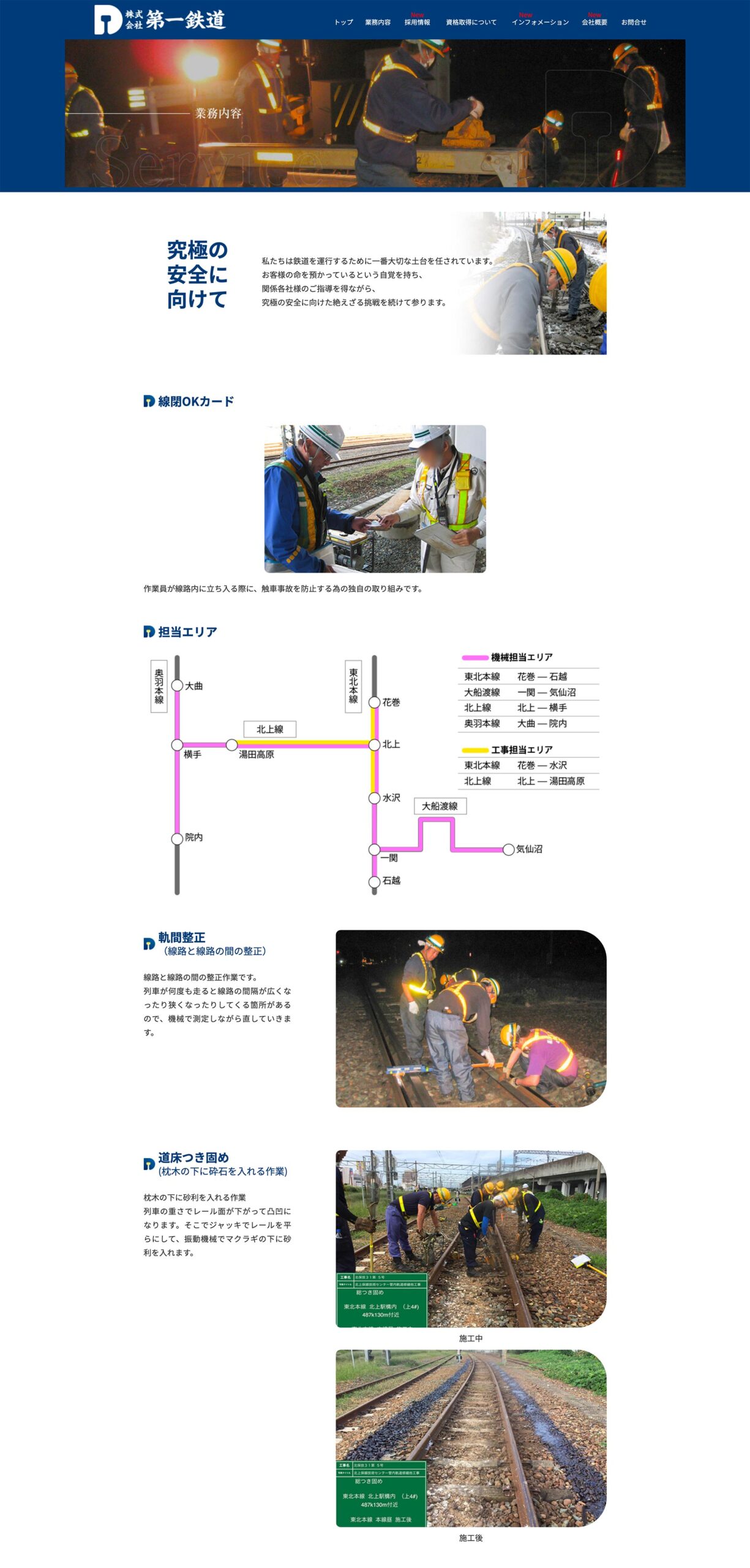 第一鉄道 様 普段は人の目に触れにくい業務ながら、社会インフラを支える、鉄道整備会社のWebサイト。 業務内容を周知すると共に、求職者に業務の内容を知ってもらいたいという希望から、各ページで作業中のスタッフの写真を使用しています。 URLhttp://www.daiichi-tetsudo.com 地域・業界・業種 北上市 / 鉄道工事 デバイス・仕様PC、スマートフォン、WordPress 担当業務等Webサイト設計/情報設計/デザイン/CMS構築/更新操作指導
