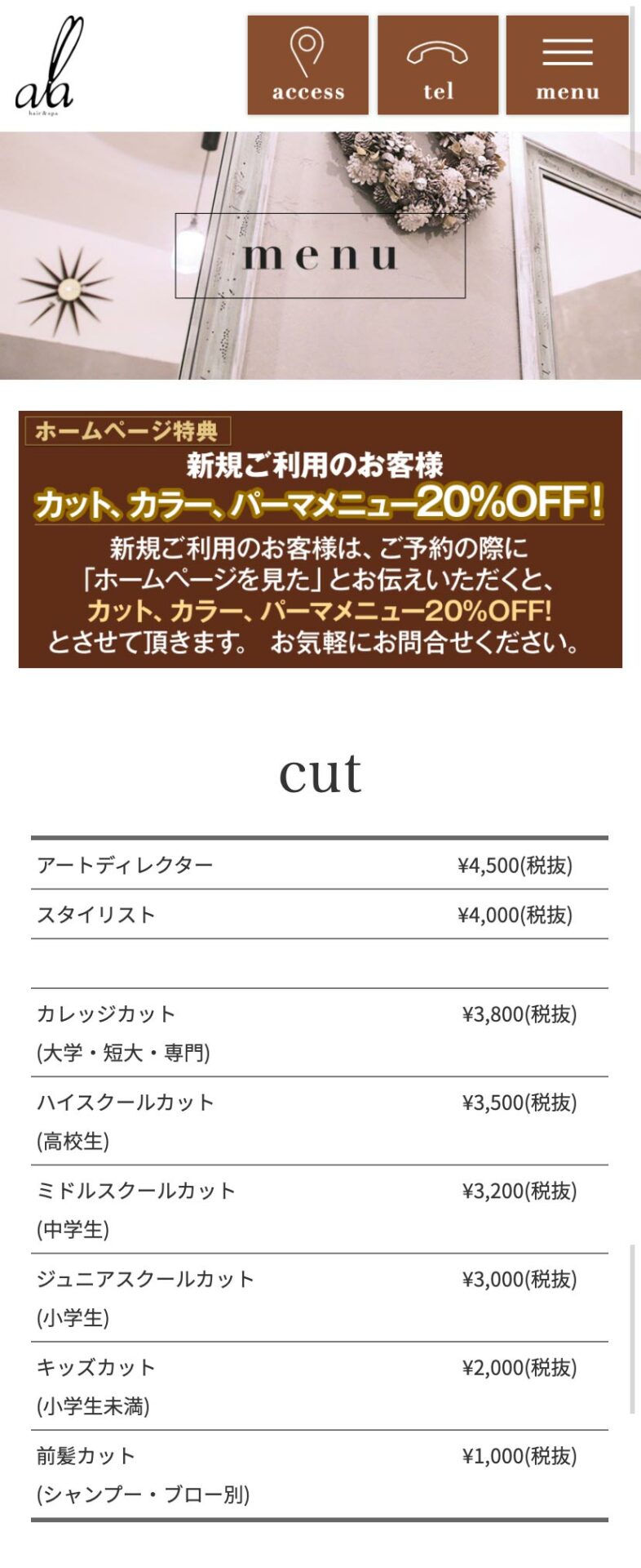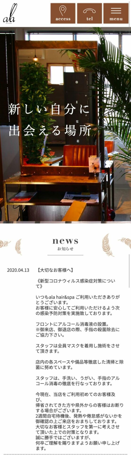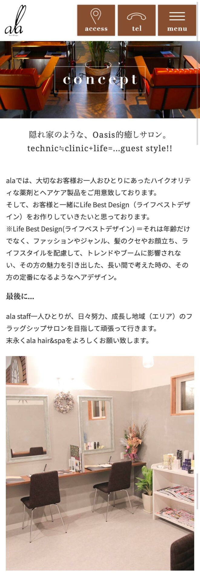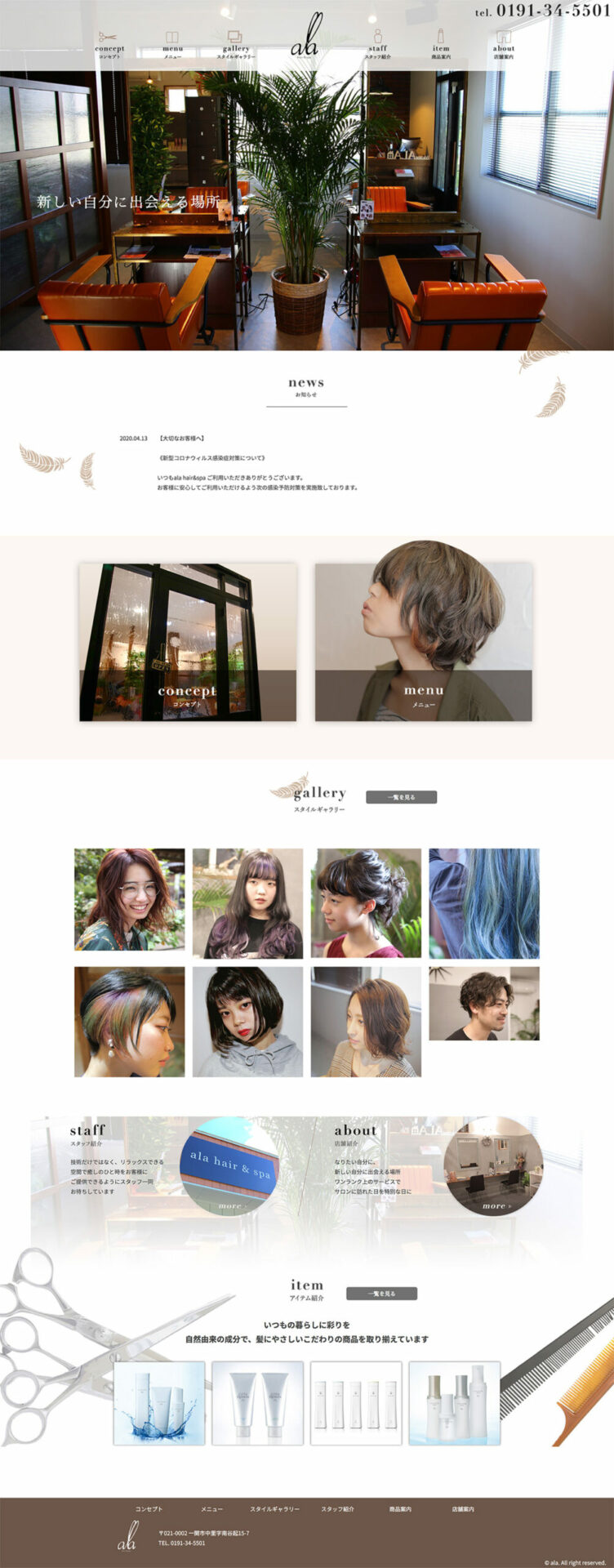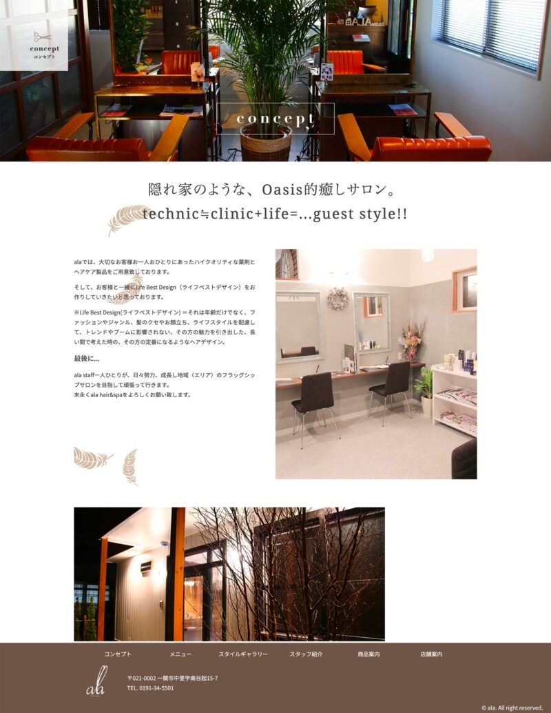 ala 様 新店舗OPENに合わせ、ホームページを作成。 トップページから店舗の雰囲気が伝わるよう、店舗の外装・内装写真を豊富に掲載。 背景色は白をベースに使用し、シンプルでこだわりのある洗練されたイメージに仕上げています。 URLhttp://www.ala-ichinoseki.com/ 地域・業界・業種 美容室 / 美容、美容室 デバイス・仕様PC、スマートフォン、NucleusCMS 担当業務等Webサイト設計/情報設計/デザイン/CMS構築/更新操作指導