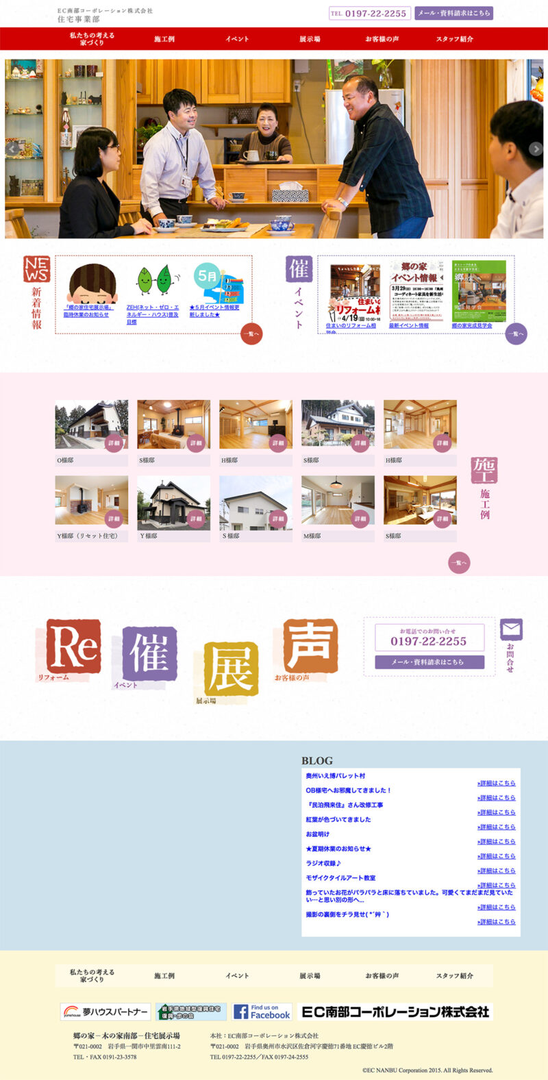 EC南部コーポレーション 住宅事業部 様 郷の家事業部としてのホームページを制作。 女性目線でのホームページとし、女性スタッフも手がけているということをPR。柔らかく優しい雰囲気に。 トップページから施工例を掲載し、施工イメージが伝わる構成となっています。 URLhttp://www.ecsatonoie.jp/ 地域・業界・業種 奥州市 / 住宅建築 デバイス・仕様PC、スマートフォン、NucleusCMS 担当業務等Webサイト設計/情報設計/デザイン/CMS構築/更新操作指導