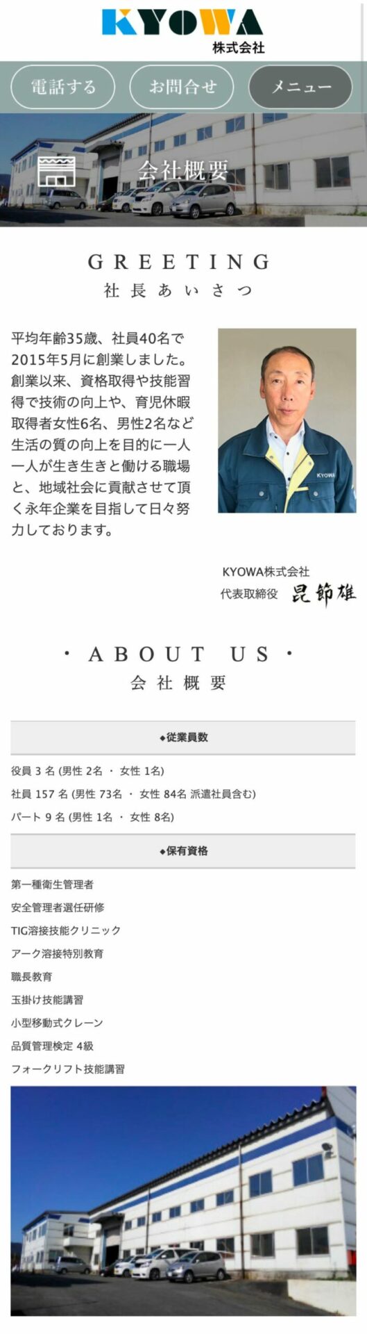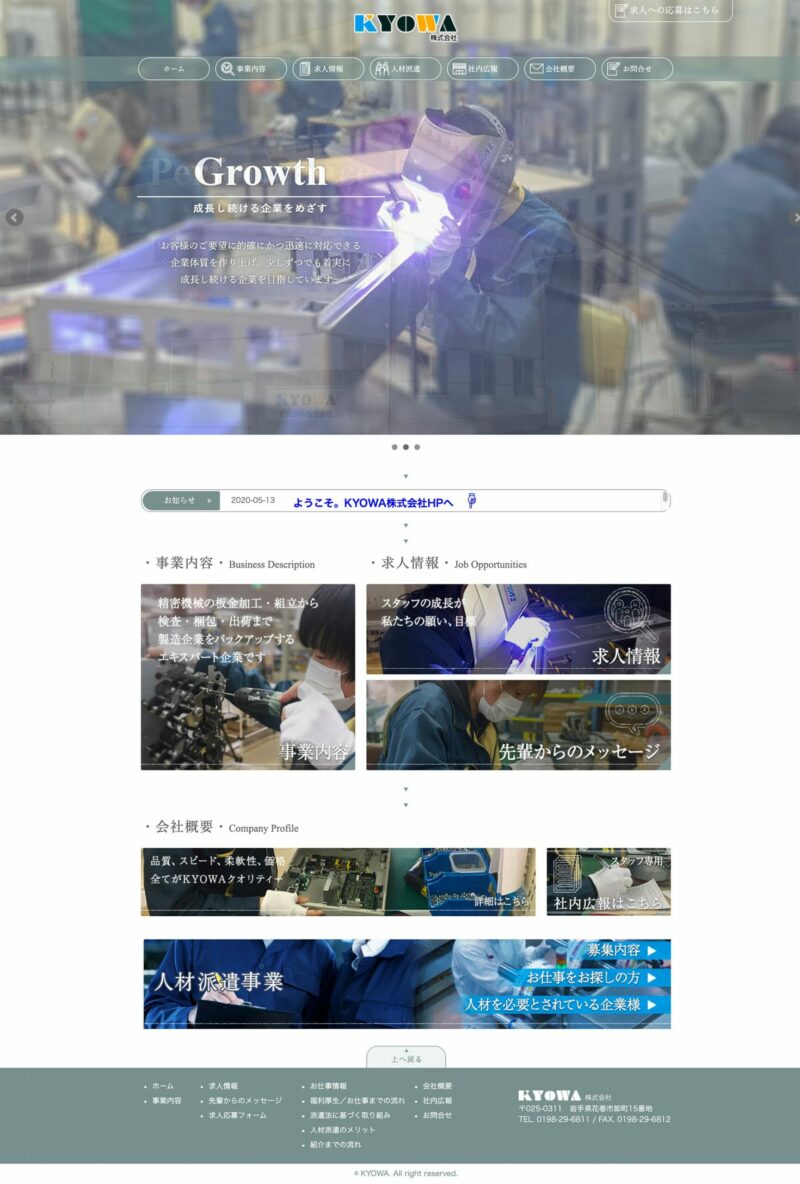 KYOWA株式会社 様 精密機器の組立と金属鈑金溶接仕上加工などを行う、KYOWA株式会社様のWebサイト。 事業内容紹介の他、求職者に向けた採用情報も発信したいとのことから、各所に工場内で働くスタッフの作業風景を多数掲載。 写真が映えるよう、全体の配色あhモノトーン調の落ち着いた雰囲気にしました。 URLhttp://www.kyowa-kabu.com/ 地域・業界・業種 花巻市 / 精密機械組立、板金加工業 デバイス・仕様PC、スマートフォン、NucleusCMS 担当業務等Webサイト設計/情報設計/デザイン/CMS構築/更新操作指導