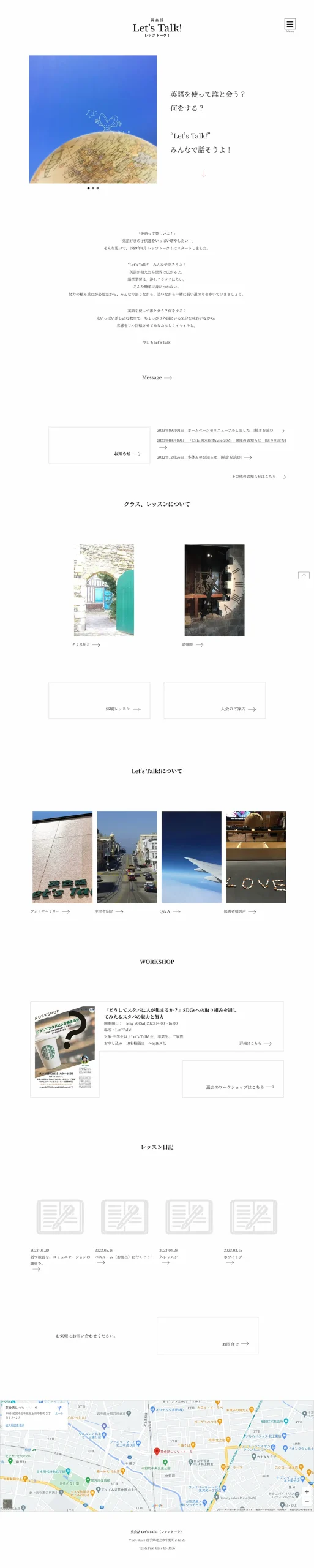 英会話 Let’s Talk! 様 読みやすさを優先した、シンプルでミニマルな構成。洗練された雰囲気にまとめつつ、細かいインタラクションを加え、クリックしてページを進む、Web本来のワクワク感を損なわないようにしています。 URLhttp://www.letstalk1989.com/ 地域・業界・業種 北上市 / 英会話教室 デバイス・仕様PC、スマートフォン、WordPress 担当業務等Webサイト設計/情報設計/デザイン/CMS構築/更新操作指導