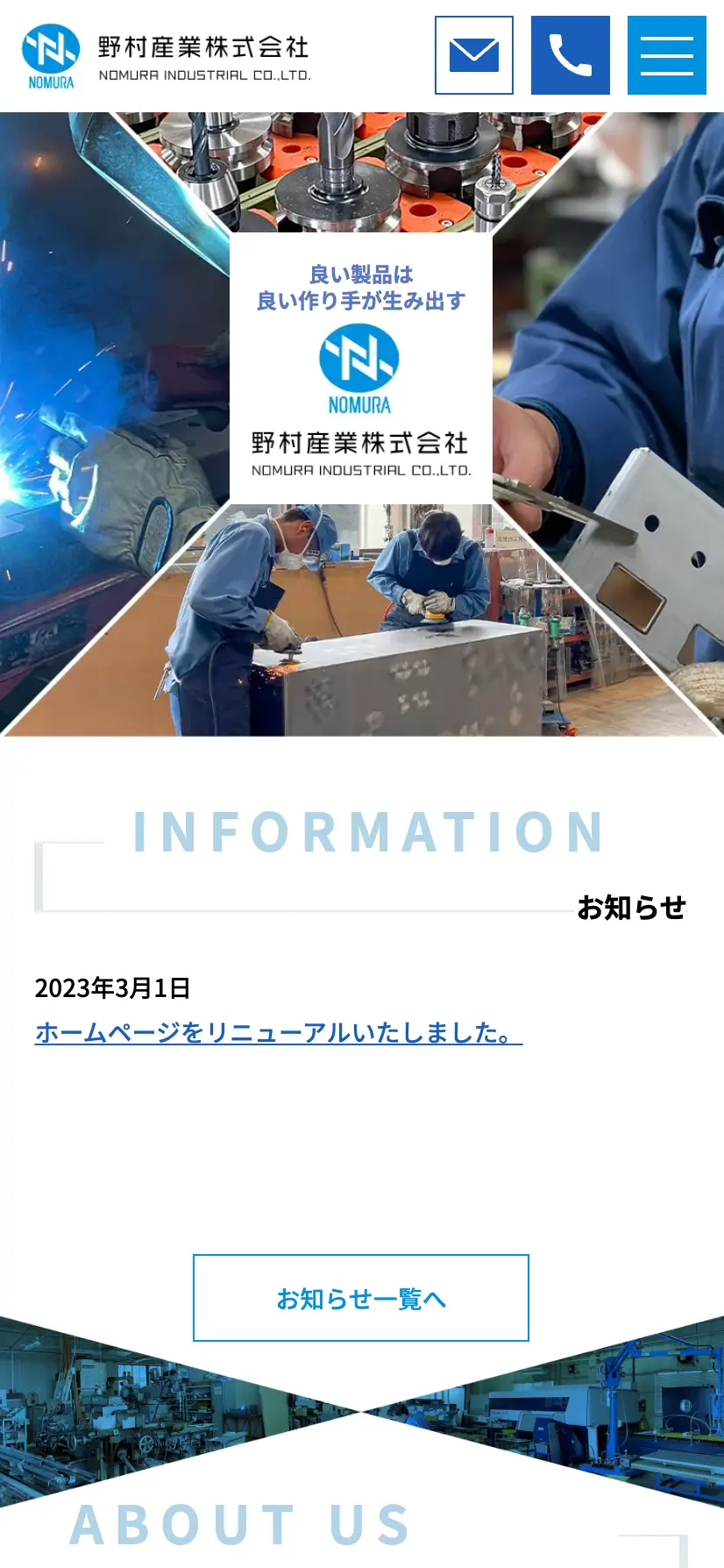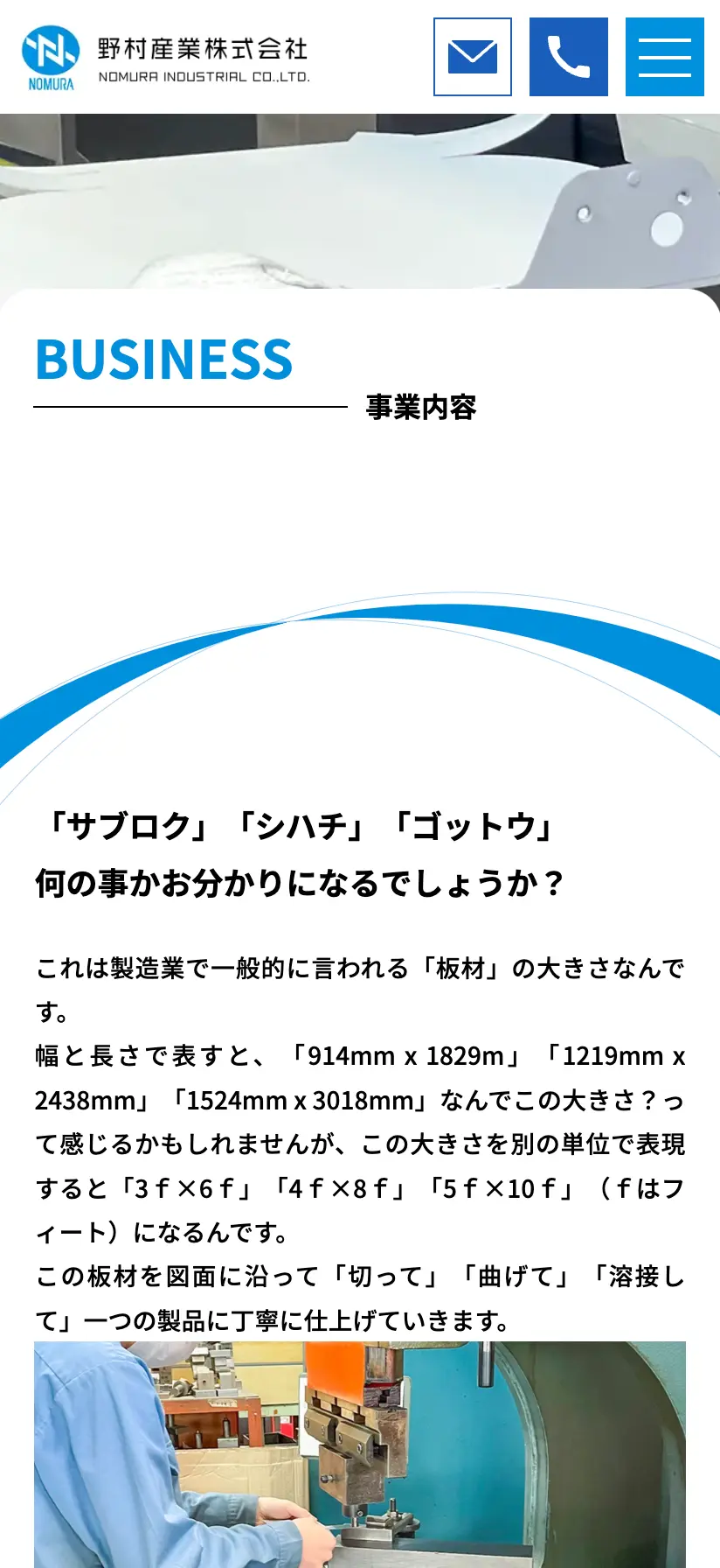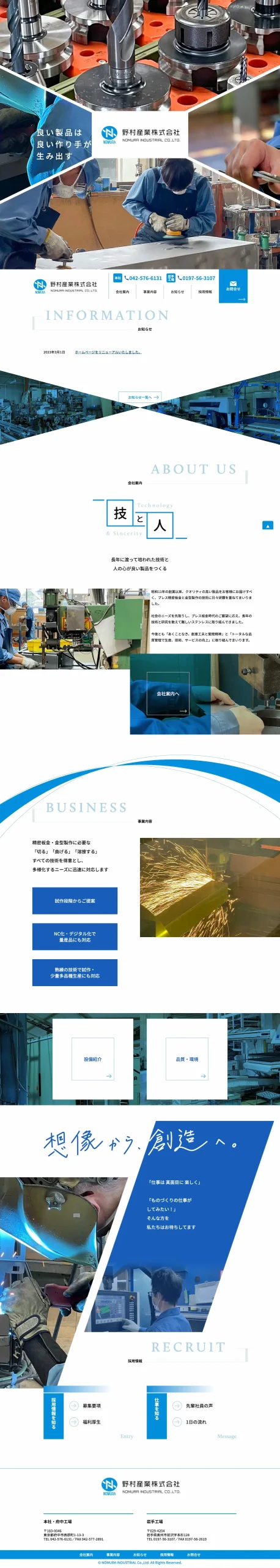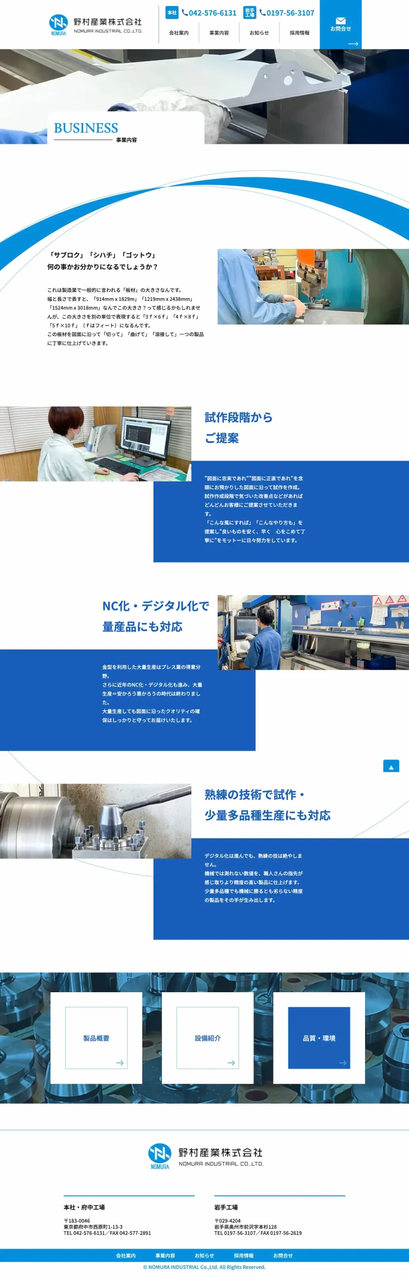 野村産業株式会社 様 白をベース色に作成。 ポイント色には企業カラーである水色、青系の配色を採用し、「誠実さ」を表現。 メインイメージには作業風景を大きく掲載しインパクトのある構成に。 各写真や装飾は、直線や曲線を用い、加工製品の形を表現。 スタイリッシュで 洗 練されたイメージを与えられるようデザイン。 URLhttp://nomura-sangyo.co.jp/ 地域・業界・業種 府中市/奥州市 / 精密板金加工 デバイス・仕様PC、スマートフォン、WordPress 担当業務等Webサイト設計/情報設計/デザイン/CMS構築/更新操作指導
